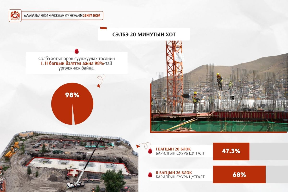 - Мөн багц нэгийн 1786 айлын 20 блок орон сууцны барилгын суурь цутгалтын ажил 47.3 хувь, багц хоёрын 2028 айлын 26 блокийн суурь цутгалтын ажил 68 хувьтай тус тус үргэлжилж байна.