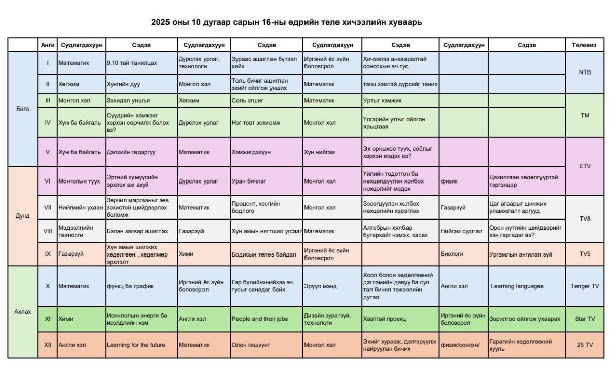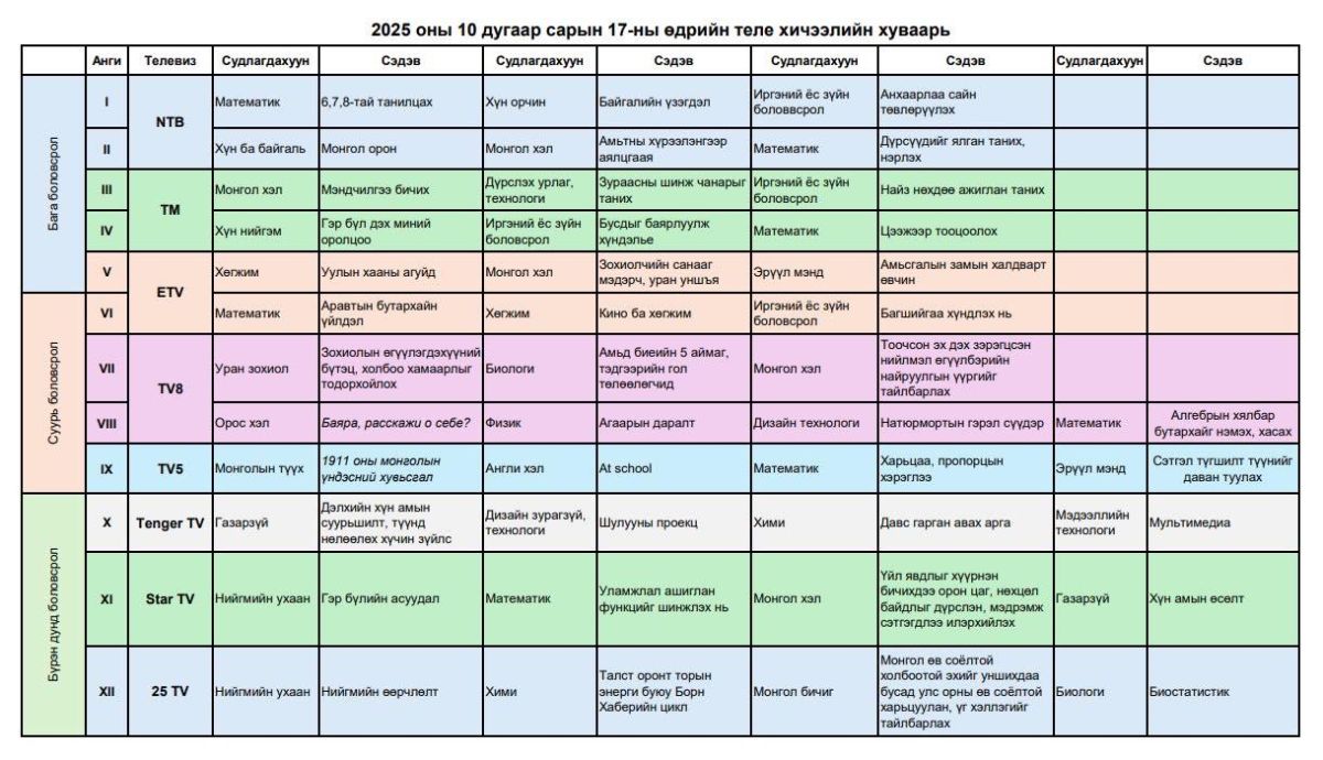 2025 оны 10 дугаар сарын 16,17-ны өдрүүдэд 9:00-17:00 цагийн хооронд дараах сувгуудаар теле хичээлийг хүлээн авч үзээрэй.