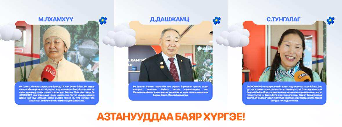 Голомт банк харилцагчдынхаа хуримтлуулах зуршлыг дэмжих зорилгоор “Хадгаламжтай аялал” аяныг 2 дахь жилдээ амжилттай хэрэгжүүлж байна. Аяны хүрээнд 2025 онд нийт 30 азтаныг хосоор нь БНСУ /Жэжү/, Тайланд, Вьетнам зэрэг орнуудаар аялах аяллын эрхээр урамшуулахаар төлөвлөөд байгаа юм. Харилцагчид аянд оролцохын тулд 6 сараас дээш хугацаатай хадгаламждаа, 100,000₮-өөс дээш дүнгээр орлого хийсэн эсвэл шинээр хадгаламж нээсэн байх шаардлагатай. Харин аяны нөхцөлийг биелүүлсэн тохиолдолд автоматаар сугалаа үүсэх болно.
