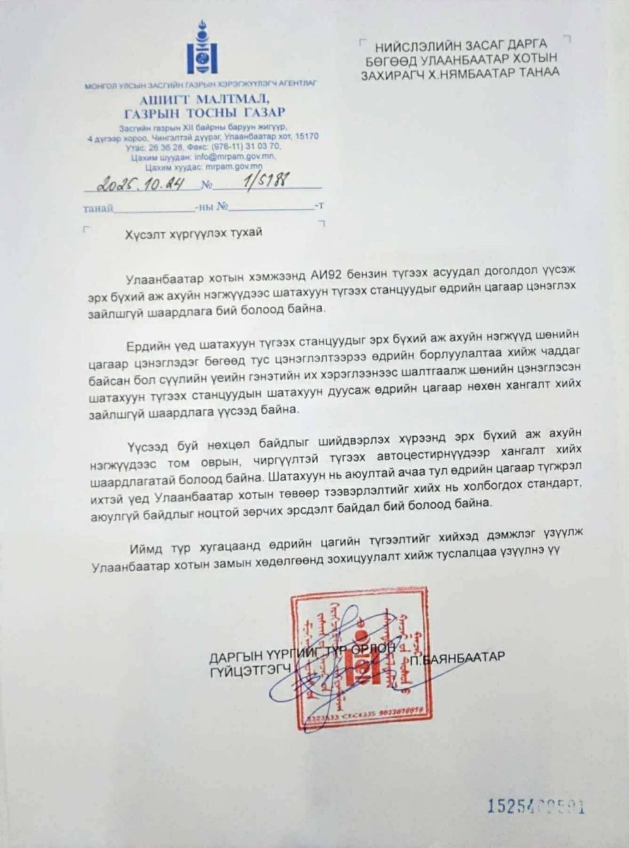 Үүсээд буй нөхцөл байдлыг шийдвэрлэх хүрээнд бид том оврын, чиргүүлтэй түгээх автоцестирнүүдээр хангалт хийх шаардлагатай байна. Шатахуун нь аюултай ачаа тул өдрийн цагаар түгжрэл ихтэй үед Улаанбаатар хотын төвөөр тээвэрлэлтийг хийх нь тодорхой стандарт, аюулгүй байдлыг ноцтой зөрчиж эрсдэлт байдал бий болоод байна. Иймд түр хугацаанд өдрийн цагийн түгээлтийг хийхэд дэмжлэг үзүүлж Улаанбаатар хотын замын хөдөлгөөнд зохицуулалт хийж туслалцаа үзүүлнэ үү” гэжээ.