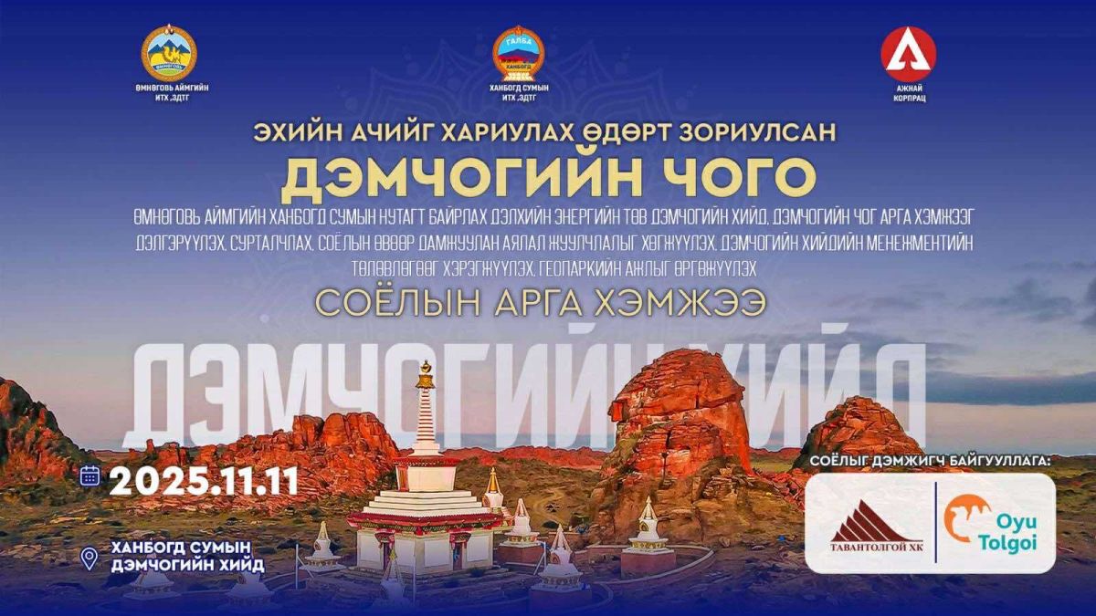 Өмнөговь аймгийн Ханбогд сумын нутагт орших Дэлхийн энергийн төв — Дэмчогийн хийд болон “Дэмчогийн Чого” соёлын арга хэмжээг олон нийтэд сурталчлан таниулах, соёлын өвөөр дамжуулан аялал жуулчлалыг хөгжүүлэх, мөн Дэмчогийн хийдийн менежментийн төлөвлөгөөг хэрэгжүүлэх, геопаркийн үйл ажиллагааг өргөжүүлэх зорилгоор Эхийн ачийг хариулах өдөрт зориулсан “Дэмчогийн Чого” соёлын арга хэмжээ 2025 оны 11 дүгээр сарын 11-ний өдөр Ханбогд сумын Дэмчогийн хийдэд зохион байгуулагдана. Арга хэмжээний хүрээнд “Oxford Mindfulness” буюу санамсрын бясалгалын хичээлийг Гавж Д.Нямсамбуу удирдан явуулах бөгөөд соёл, сэтгэлийн тэнцвэр, бясалгалын үнэ цэнийг түгээх зорилготой юм. Та бүхнийг “Дэмчогийн Чого” соёлын арга хэмжээнд хүрэлцэн ирж говийн өв соёл, сэтгэлийн гэгээрэл, энергийн нэгдлийг мэдрэхийг урьж байна.