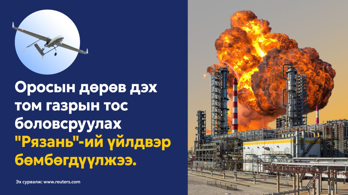 Украйн улс өнгөрсөн амралтын өдөр Москвагийн зүүн хэсэгт орших, Оросын дөрөв дэх том газрын тос боловсруулах “Рязань” үйлдвэрийг бөмбөгджээ. Үйлдвэр галд автсанаар үйл ажиллагаа нь зогссон байна. Тус үйлдвэр жилд 13 сая тонн түүхий тос боловсруулж, 2.3 сая тонн бензин, 3.4 сая тонн дизель түлш үйлдвэрлэж байжээ. Зөвхөн 2.3 сая тонн бензинийг Улаанбаатар хотын өнөөгийн хэрэглээтэй харьцуулбал 160 жил хангах өндөр дүн юм. Хэрэв манай улсын хэрэгцээгээр тооцвол 10 жил хангахуйц болно. Эндээс “Рязань” үйлдвэрийн хүчин чадал ямар өргөн цар хүрээтэй байсан нь харагдана.