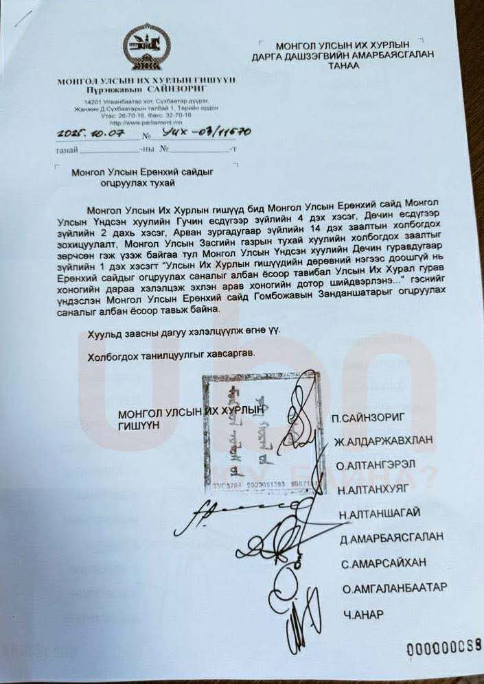 Сануулахад, тэрбээр Ерөнхий сайд Г.Занданшатарын ЗГ-ын огцруулах бичигт танхимаасаа ганцаараа гарын үсэг зурсан байдаг.