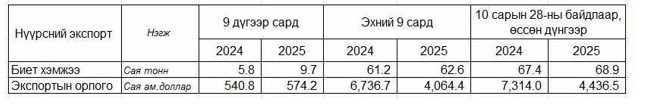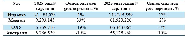 Тус улсын Гаалийн ерөнхий газрын мэдээллээр, Монгол Улс 2025 оны есдүгээр сард БНХАУ руу 9.29 сая тонн нүүрс экспортолжээ. Энэ нь өнгөрсөн оны мөн үетэй харьцуулахад 33 хувиар өссөн үзүүлэлт бөгөөд 2015 оноос хойших хамгийн өндөр түвшинд хүрсэн байна.