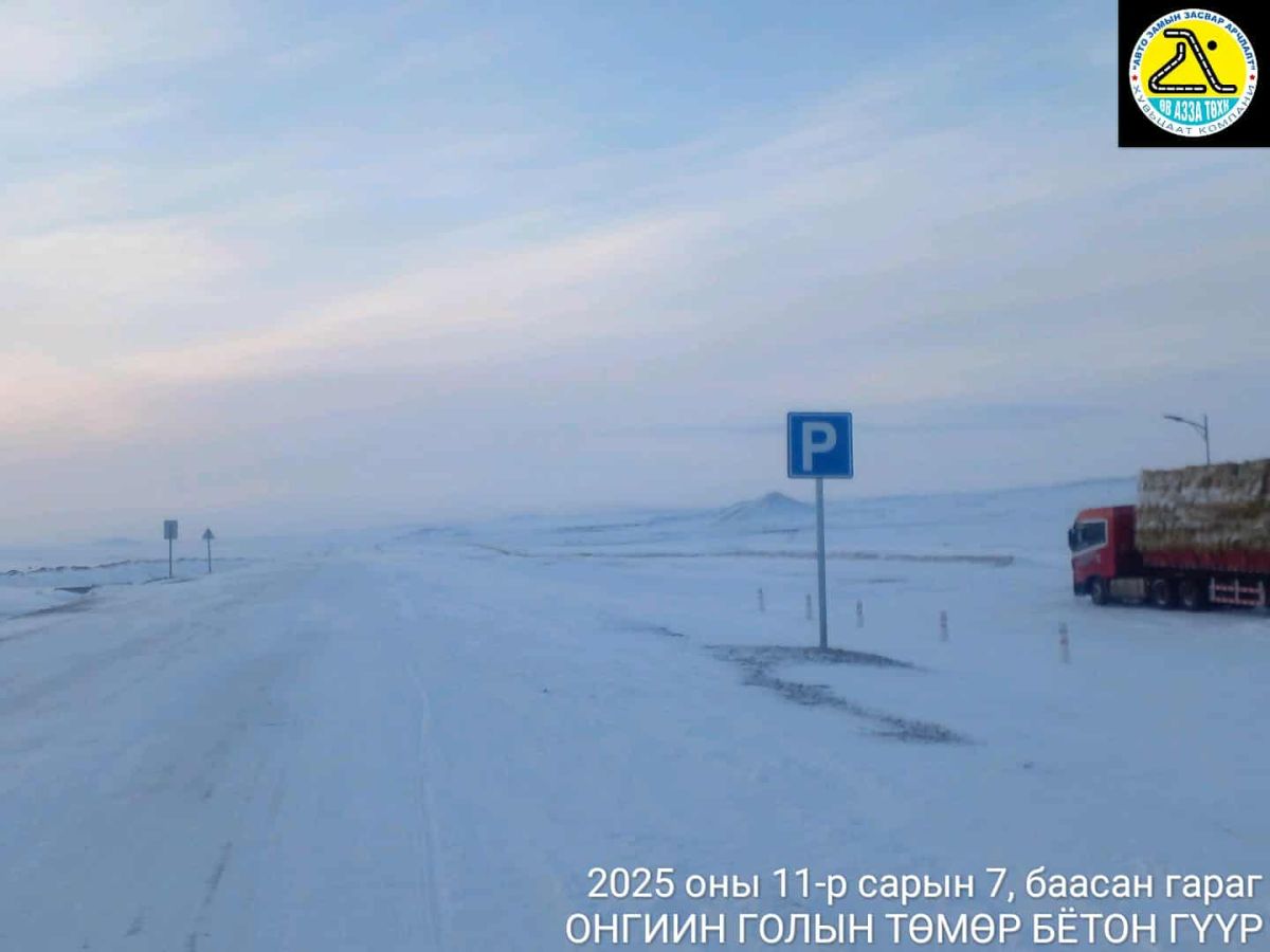 Өнгөрсөн хоногт /2025.11.06-07/ цас их хэмжээгээр орсон Улаанбаатар-Арвайхээр-Арвайхээр-Баянхонгор чиглэлийн А0301, А0302 дугаартай хатуу хучилттай улсын чанартай авто замын зорчих хэсэгт зам, даваа гүвээнд халтиргаа гулгаа, мөстөлт үүссэн байна.