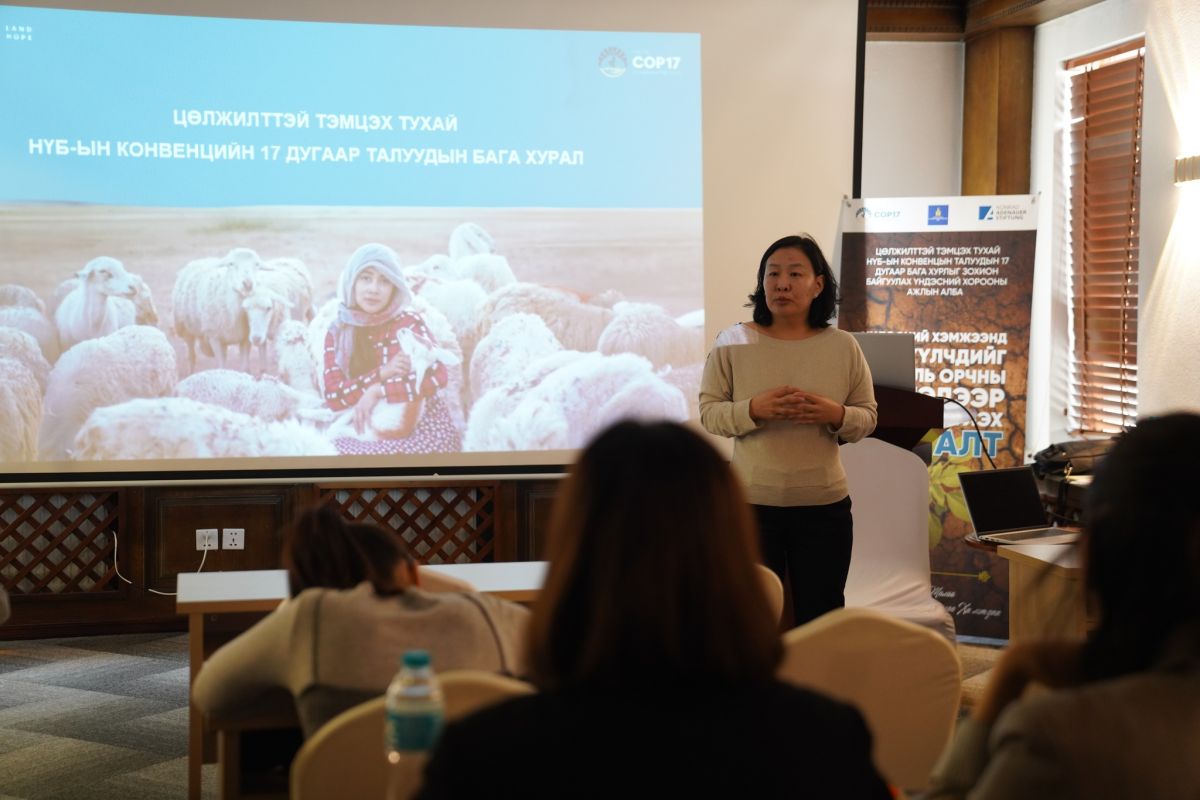 Мөн COP17-г эх орондоо зохион байгуулах явцад сэтгүүлчдэд анхаарвал зохих асуудлууд, тухайн улс орны иргэд тодорхой мэдлэг мэдээлэлтэй байхын давуу тал, боломж, ЦЭНХЭР болон НОГООН бүсийн ялгаа, дэлхий дахинд цөлжилт, газрын доройтол ямар хэмжээнд хүрсэн, улс орнуудад үзүүлж буй нөлөөлөл, энэ чиглэлд НҮБ-аас баримталж буй гол бодлого, чиг хандлагын талаар мэдээлэл өгч, сэтгүүлчдийн сонирхсон асуултад хариулав.