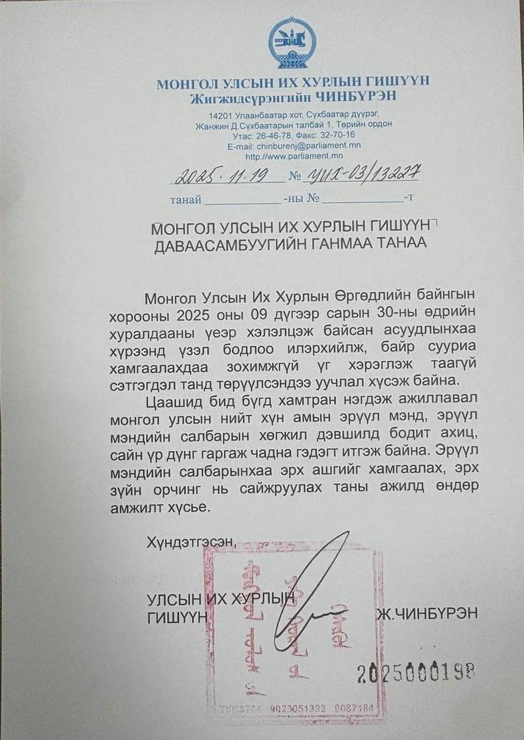 Улмаар Ёс зүйн дэд хорооноос Эрүүл мэндийн сайд Ж.Чинбүрэнг уучлал гуйхыг даалгасан байдаг. Үүний дагуу Эрүүл мэндийн сайд Ж.Чинбүрэн УИХ-ын гишүүн Д.Ганмаагаас албан ёсоор уучлал гуйжээ.