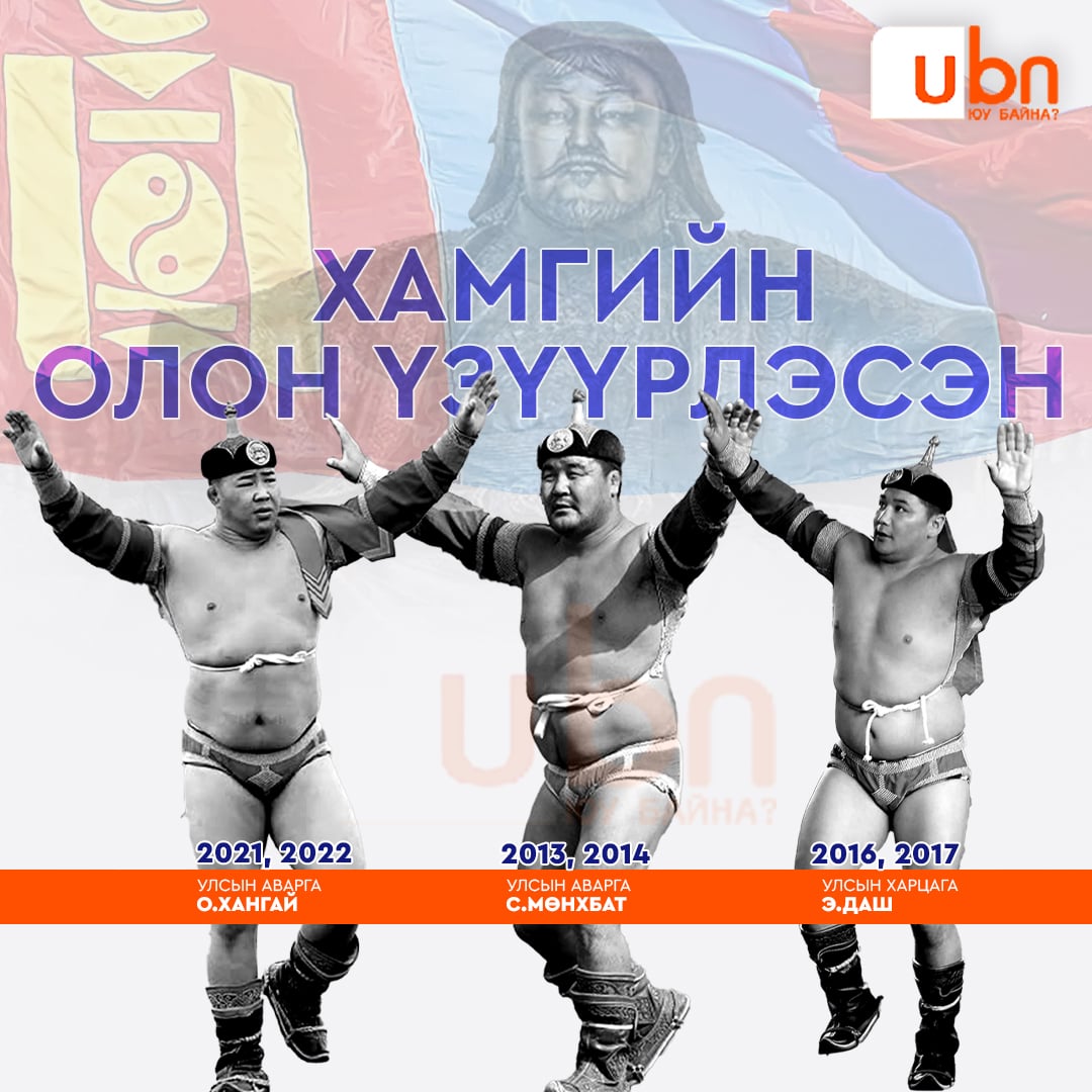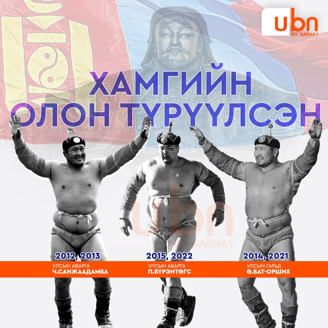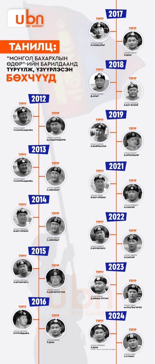 Монгол бахархлын өдөрт зориулсан барилдаан 2012 оноос эхлэн 13 удаа зохион байгуулагдахад, Улсын аварга С.Мөнхбат, О.Хангай, Улсын харцага Э.Даш нар тус бүр 2 удаа үзүүрлэсэн байна.