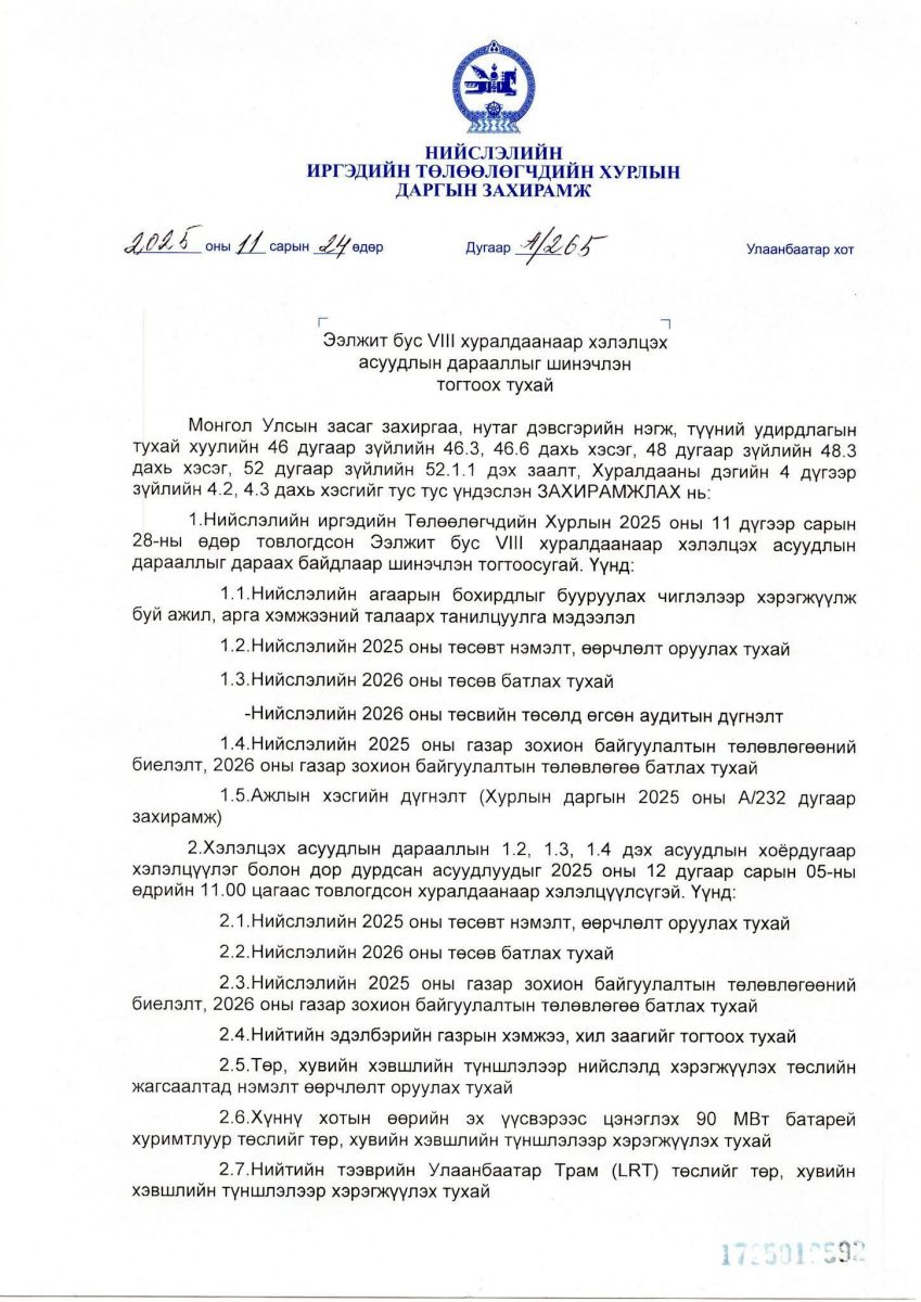 Нийслэлийн иргэдийн төлөөлөгчдийн хурал ээлжит бусаар хуралдахаар болжээ. Тодруулбал, хуралдаан 11.00 цагт болох бөгөөд хэлэлцэх асуудлыг дараах байдлаар тогтоожээ. Үүнд, тухайлбал нийслэлийн 2025 оны төсөвт нэмэлт өөрчлөлт оруулах тухай болон ирэх оны төсвийг хэлэлцэх аж.