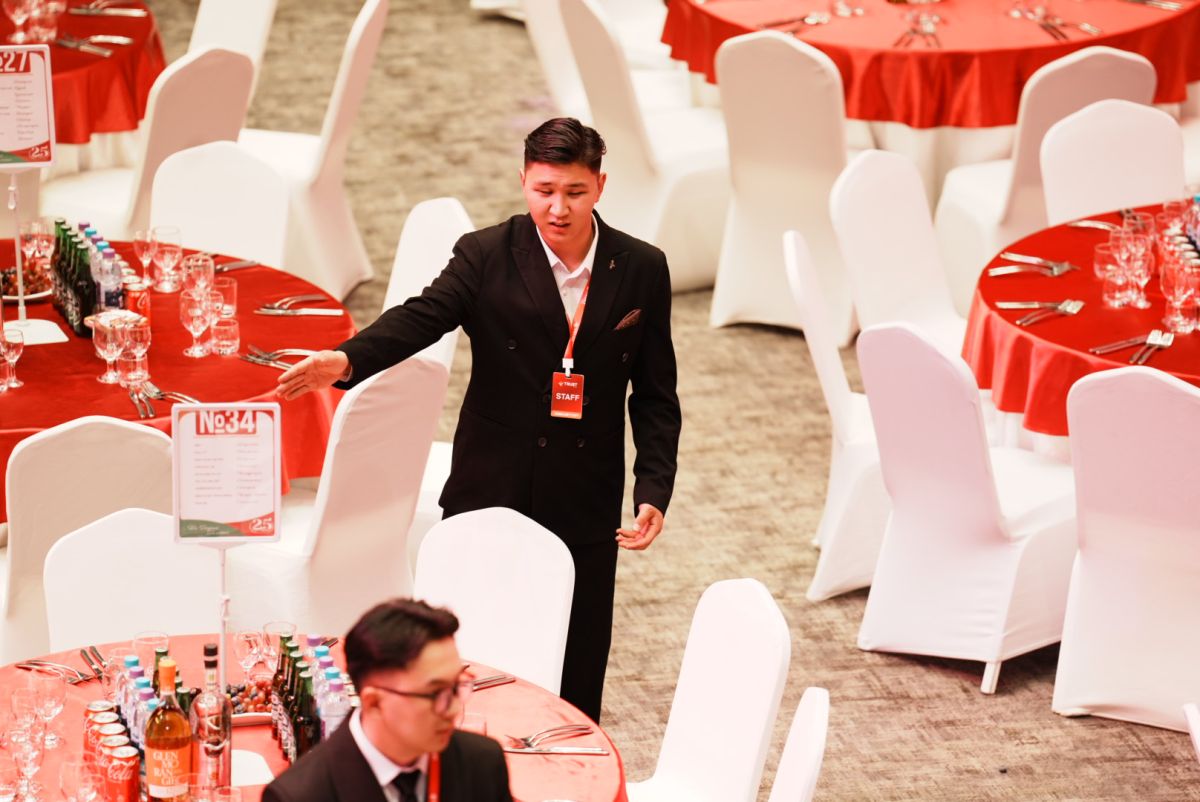Танхимд ормогц улаан хүрэн өнгө анхаарал татав. Брэндийн өнгө гэж нэрлэсээр ирсэн энэ өнгө өнөөдөр илүү тод, илүү утгатай харагдана. Тайзны гэрэл, ширээний бүтээлэг, хүртэл заалын арын баннер нэг өнгөөр амьсгалж, компанийн 25 жилийн тэмдэглэлт өдрийг яг өөрийнх нь өнгөөр буджээ.