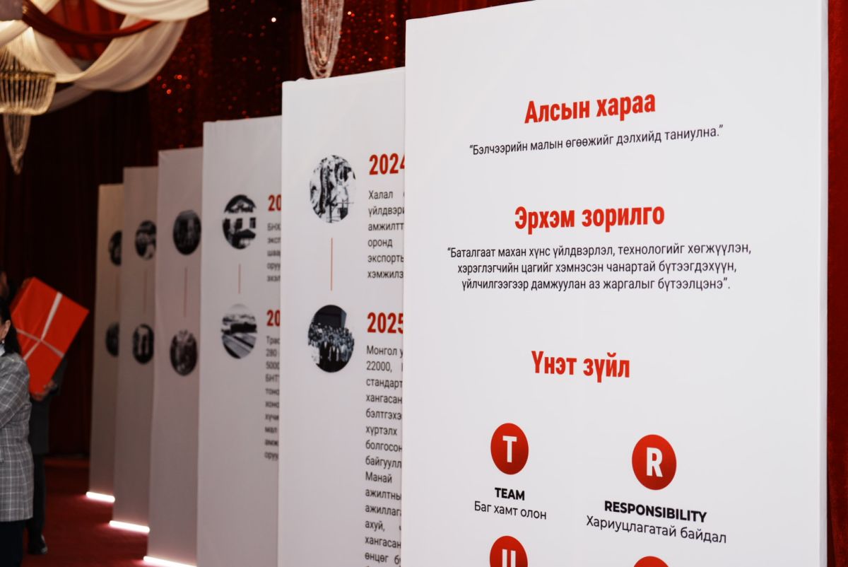 2000 он. Зургаахан хүнээс эхэлсэн жижиг өрөө. Өглөөний жижүүр, хөргүүрийн дуу, шинэ бизнес эхлэх гэж байгаа залуусын догдлол. Тэр үеийн түүхийг энэ танхимд байрлуулжээ. Хажууханд нь өнөөдрийнх: 280 ажилтан, олон улсын FSSC:22000, HACCP, ХАЛАЛ стандартууд бүрэн нэвтэрсэн, Монголын мах, махан бүтээгдэхүүний салбарт өөрийн гэсэн тогтолцоотой томоохон тоглогч болсон байдлыг зэрэгцүүлсэн нь ихийг өгүүлэв.