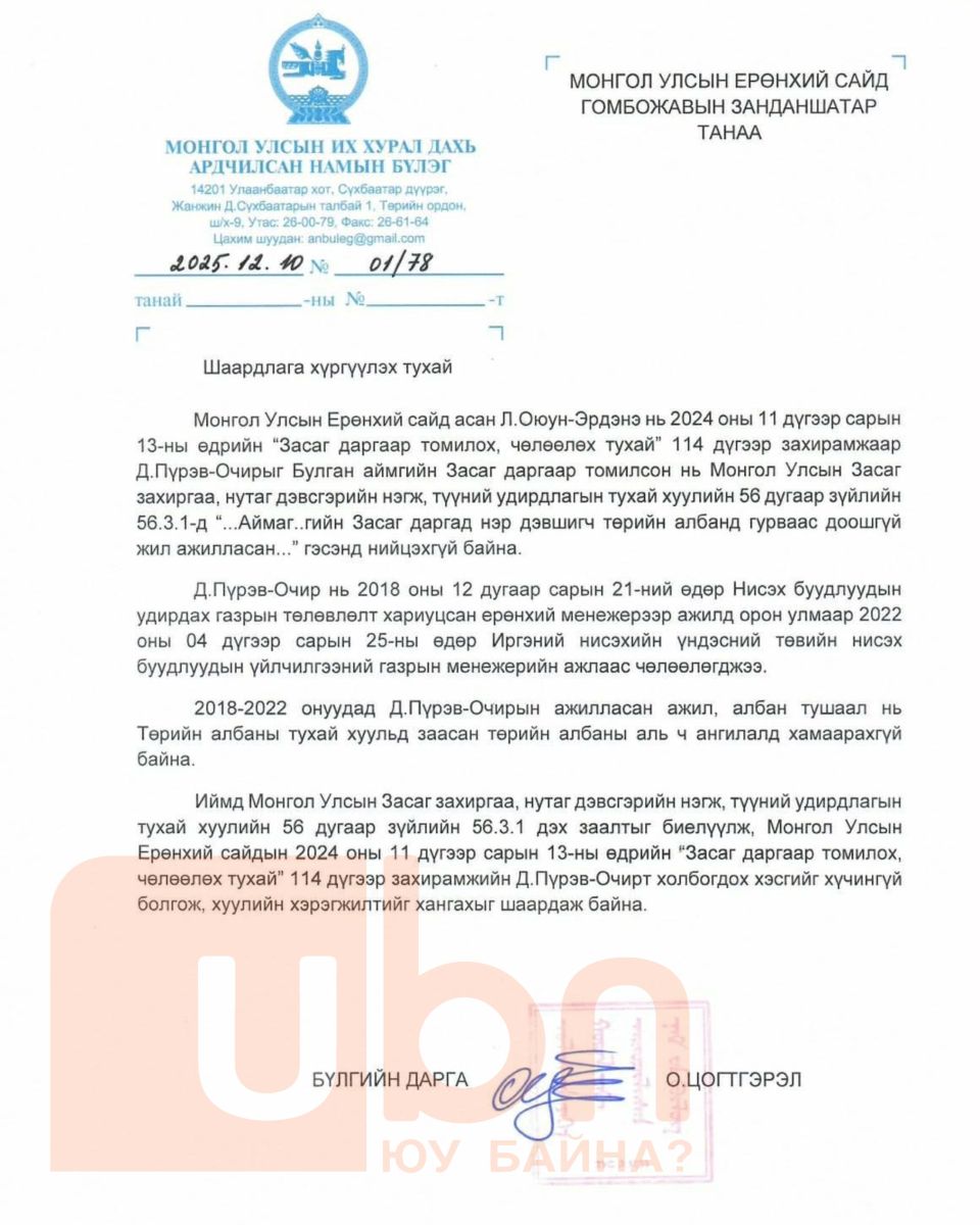 УИХ дахь Ардчилсан намын бүлгийн дарга О.Цогтгэрэл Ерөнхий сайд Г.Занданшатарт албан шаардлага хүргүүлжээ. Уг шаардлагадаа Булган аймгийн Засаг дарга Д.Пүрэв-Очирыг албан тушаалаас нь чөлөөлж, хуулийн хэрэгжилтийг хангах ёстой гэж үзсэн байна.