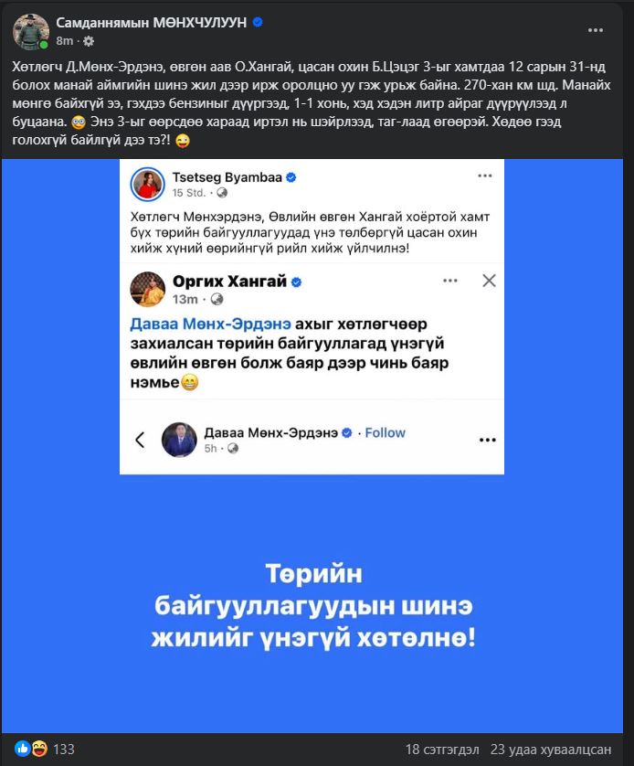 Тэрбээр "Хөтлөгч Д.Мөнх-Эрдэнэ, өвгөн аав О.Хангай, цасан охин Б.Цэцэг гурвыг хамтдаа 12 сарын 31-нд болох манай аймгийн шинэ жил дээр ирж оролцоно уу гэж урьж байна. 270-хан км шүү дээ. Манайх мөнгө байхгүй ээ. Гэхдээ бензиныг нь дүүргээд, 1, 1 хонь, хэд хэдэн литр айраг дүүргээд л буцаана. Энэ гурвыг өөрсдөө хартал нь шэйрлээд, "таг"-лаад өгөөрэй" гэв.