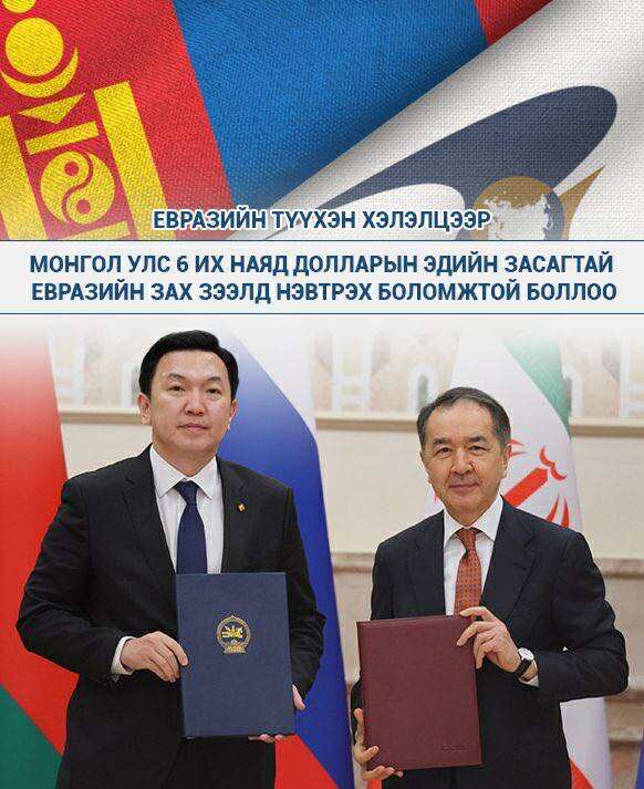 Монгол Улс 6 их наядын долларын эдийн засагтай евразийн зах зээлд нэвтрэх боломжтой боллоо. Тодруулбал, эл хэлэлцээрээр дизель түлшний гаалийн татвар 0 болно. Ингэснээр литр тутмын үнэ дор хаяж 147 төгрөгөөр буурна. Дотоодын үйлдвэрлэлээ хамгаалж, шингэн, өтгөрүүлсэн сүү, шар сүү, өргөст хэмх, сонгино, төмс, лууван, шар манжинг зэрэг 8 барааг татваргүй оруулах жагсаалтаас хаслаа. Цагаан архинд 30 хувь, шар айрагт 18,75 хувийн татвар ногдуулна. Бяслаг, хайлмал бяслаг, цөцгийн тосыг Монголд импортлоход 7,5 хувийн татвартай байхаар тохиролцжээ. Нүүрс, зэсийн баяжмал гэсэн хоёр түүхий эдийн үнээс үндсэндээ бүрэн хамааралтай Монгол улсын эдийн засгийг төрөлжүүлж, илүү олон орлогын эх үүсвэртэй болгоно.