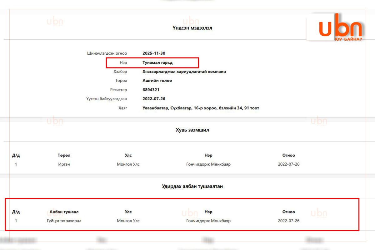 ЖИЧ: Г.Мөнхбаяр, Б.Эрдэнэсүх нарын хувийн хамаарлаас үл хамааран нэр дурдагдсан "Тунамал гарьд" ХХК-ийн хувь эзэмшил, удирдлагын мэдээллийг нягтлах зорилгоор нээлттэй мэдээллээс харахад, дараах үр дүн харагдаж байв