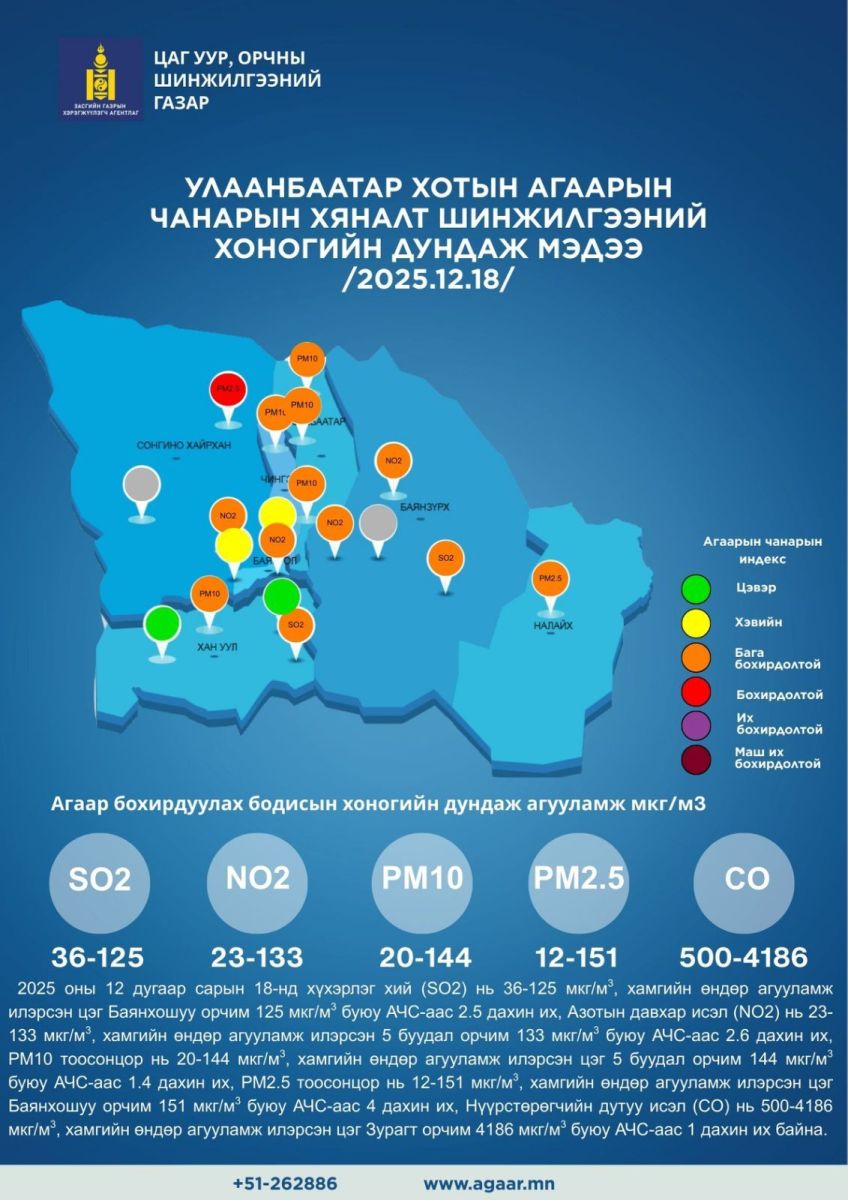 Улаанбаатар хотын агаарын чанар 2025 оны 12 дугаар сарын 18-ны өдрийн байдлаар: