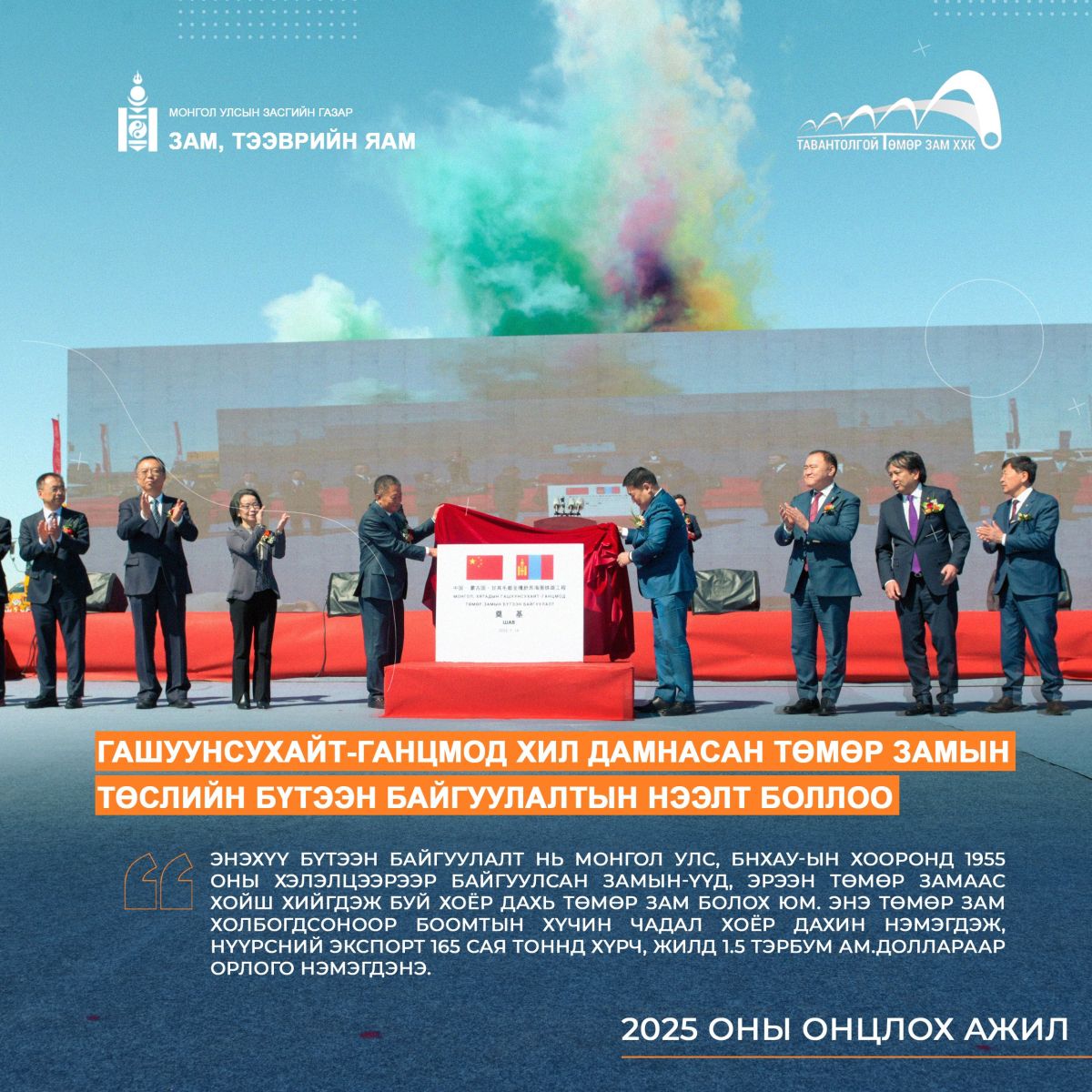 Монгол, Хятадын Гашуунсухайт-Ганцмод төмөр замын боомтын хил холболтын бүтээн байгуулалтын нээлт боллоо. Нээлтийн ёслолд Монгол Улсын Ерөнхий сайд Л.ОюунЭрдэнэ, УИХ, Засгийн газрын гишүүд, БНХАУ-ын Засгийн газрын төлөөлөгчид, ӨМӨЗО-ны Намын хорооны дарга, БНХАУ-аас Монгол Улсад суугаа Элчин сайд, БНХАУ-ын Хөгжил шинэчлэлийн хорооны дэд дарга, “Чайна Энержи” группийн ТУЗ-ийн дарга болон хоёр орны гүйцэтгэгч байгууллагын төлөөлөл оролцлоо.