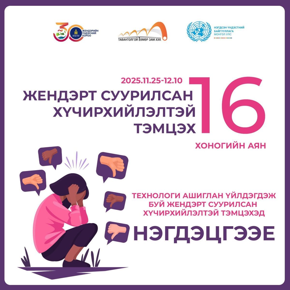 2025 оны 11 дүгээр сарын 25–наас 12 дугаар сарын 10- ны өдрүүдэд манай улс энэхүү аяныг эмэгтэйчүүд, охидын эсрэг хүчирхийллийг бууруулах, таслан зогсоох, урьдчилан сэргийлэх зорилгоор “Технологи ашиглан үйлдэгдэж буй жендэрт суурилсан хүчирхийлэлтэй тэмцэхэд нэгдье” уриан дор зохион байгуулж байна. Учир нь технологийн үсрэнгүй хөгжил, өдрөөс өдөрт өсөн нэмэгдэж буй технологийн хэрэглээ нь харамсалтайгаар ЖСХ-ийн шинэ хэлбэрүүдийг бий болгож, цахим орон зайг эмэгтэйчүүд, охидын эсрэг зэвсэг болгон хувиргаж, дижитал платформыг буруугаар ашигласнаас үүдэлтэй гарах гэмт хэргийн тоо өсөн нэмэгдсээр байна.