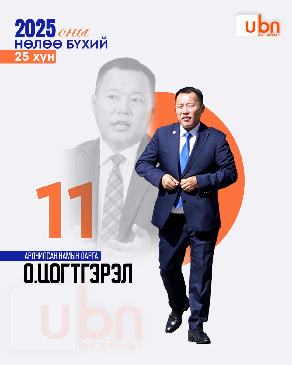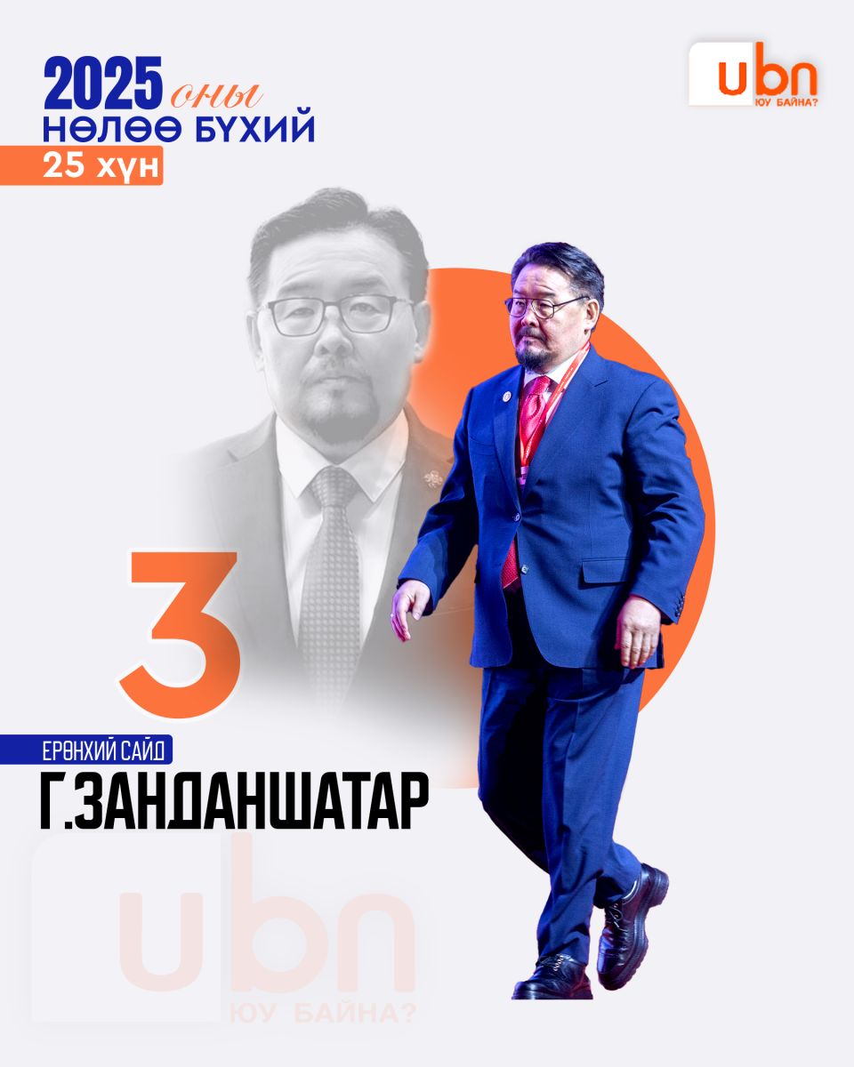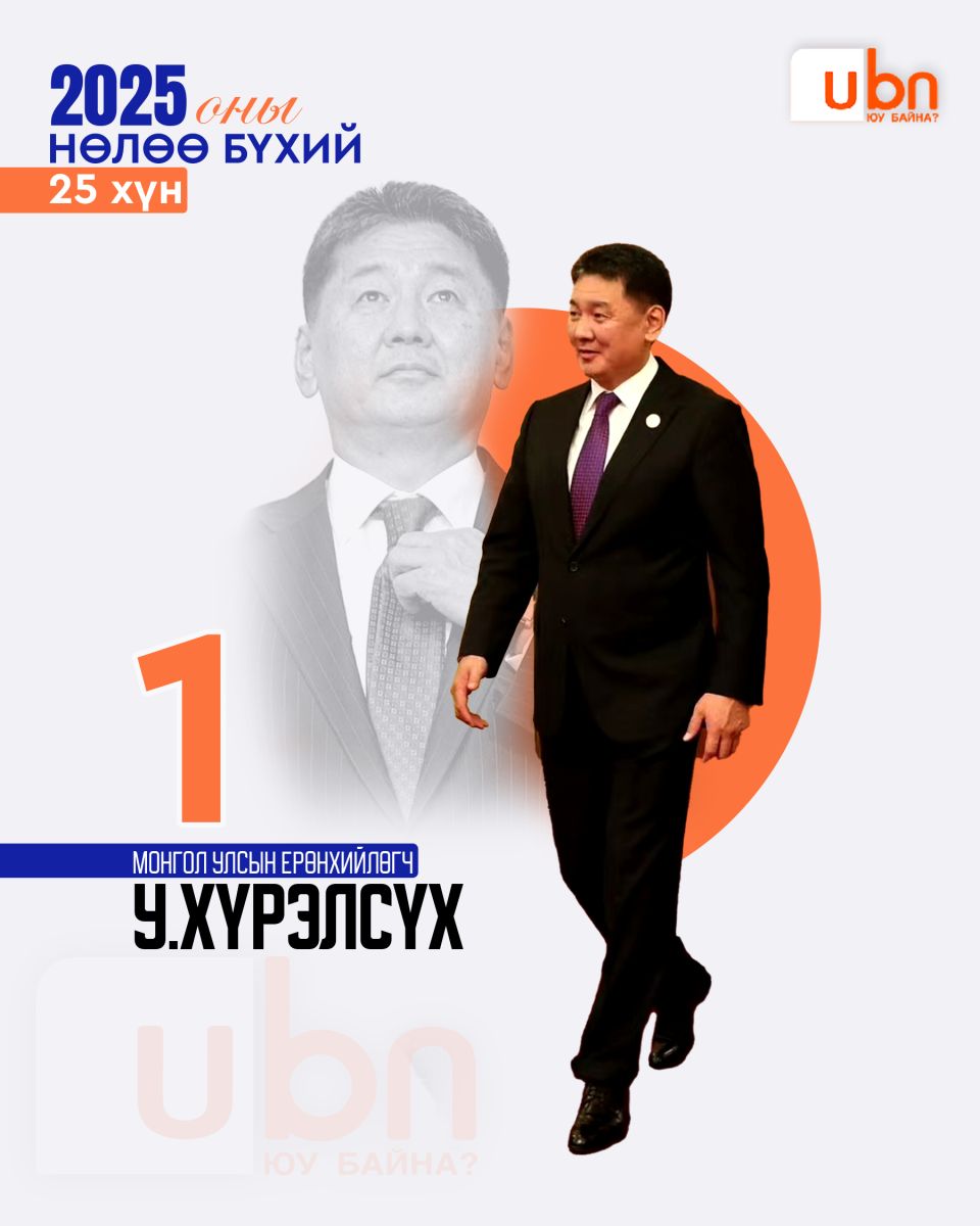 Ubn.mn мэдээллийн сайт жил бүр тухайн оныхоо нөлөө бүхий эрхмүүдийг нэрлэдэг уламжлалтай. Тэгвэл яг одоо бид 2025 оны нөлөө бүхий 25 эрхмийг нэрлэж байна. Нөлөө бүхий гэдэг нь шилдэг, сайн гэсэн утга огт биш. Сайнаар ч бай муугаар ч бай нийгмийн амьдралд хүчтэй нөлөө үзүүлж буй хүмүүсийг энэхүү номинацид шалгаруулсан ба олон нийтийн санал асуулга, экспертүүдийн үнэлгээг хослуулж оны нөлөө бүхий 25 хүнийг танд танилцуулж байгаа нь энэ билээ.