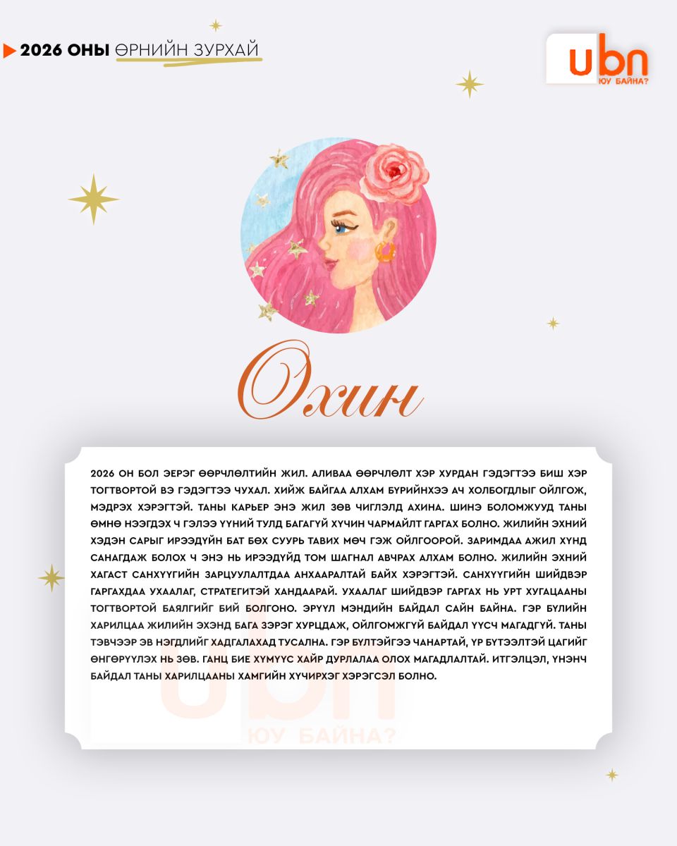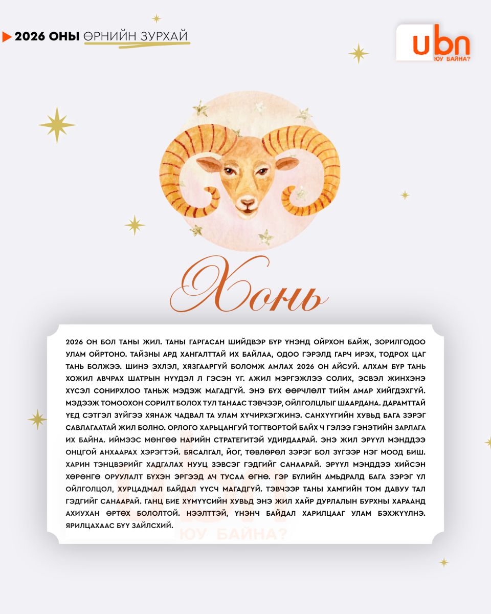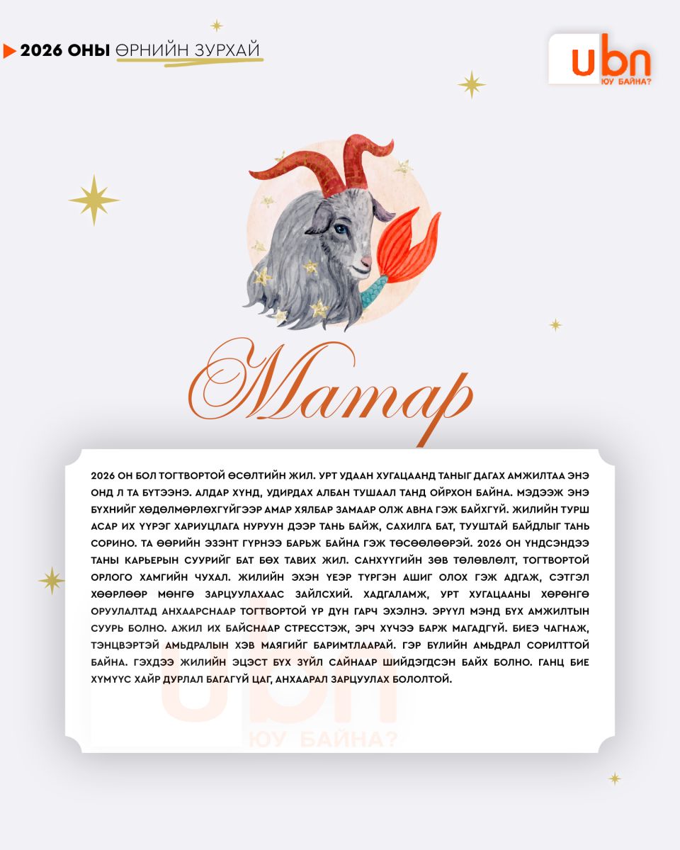 2026 он бол таны бүрэн өөрчлөлт шинэчлэлтийн жил. Амжилтын түүхийн гол дүр нь та байх болно. Таны замд тохиолдсон бүх л өөрчлөлт, сорилт, эргэлт таныг илүү сайжруулахад чиглэсэн байх нь. Карьерын хувьд тодорхойгүй, будилаантай байгаа мэт санагдаж магадгүй. Гэхдээ үүнийг саад биш, шат ахих алхам гэж хараарай. Жилийн дунд үеэс жинхэнэ боломжууд таны өмнө нээгдэнэ. Ажил мэргэжлийн зам тань гэрэлтэж, шинэ санал, боломжууд хаалгыг тань тогшино. Бизнес эрхлэгчдийн хувьд түншлэл байгуулах, стратегийн хөрөнгө оруулалт хийхэд маш таатай жил. Таны карьер урьд өмнө төсөөлөөгүй өндөрлөгт хүрэх боломжтой. Жилийн эхээр санхүүгийн зардал нэмэгдэнэ. Гэхдээ удалгүй зүг чиг нь олдож, нөхцөл байдал тогтворжино. Жилийн эцэст санхүүгийн байдал мэдэгдэхүйц сайжирсан байна. Гол нь юунд ч яарах хэрэггүй. Эрүүл мэндийн хувьд онцгой анхаарал шаардсан жил байх нь. Жилийн эхээр ядрах, эрч хүч буурах мэдрэмж төрж магадгүй. Энэ бол бие тань өөрчлөлт хэрэгтэйг сануулж буй дохио юм. Гэр бүлийн амьдрал таны тэвчээрийг сорино. Тайван харилцаа, тууштай хандлагын тусламжтайгаар эв нэгдлийг хадгалж үлдэх хэрэгтэй. Ганц бие, болзож буй, эсвэл тогтвортой харилцаатай хэн боловч 2026 онд сэтгэлийн холбоогоо гүнзгийрүүлэх, илүү бат харилцаа үүсгэх боломжтой.