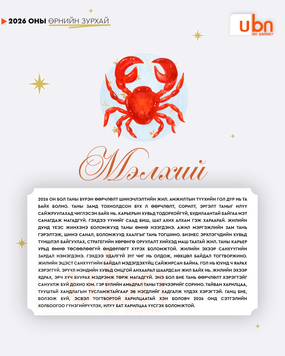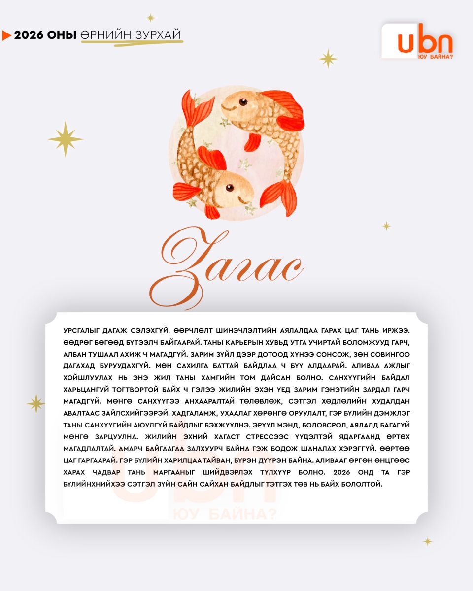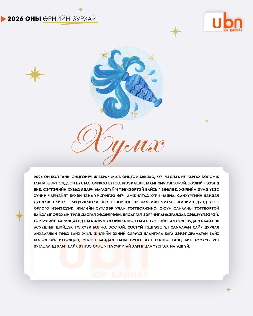 2026 он бол таны бүрэн өөрчлөлт шинэчлэлтийн жил. Амжилтын түүхийн гол дүр нь та байх болно. Таны замд тохиолдсон бүх л өөрчлөлт, сорилт, эргэлт таныг илүү сайжруулахад чиглэсэн байх нь. Карьерын хувьд тодорхойгүй, будилаантай байгаа мэт санагдаж магадгүй. Гэхдээ үүнийг саад биш, шат ахих алхам гэж хараарай. Жилийн дунд үеэс жинхэнэ боломжууд таны өмнө нээгдэнэ. Ажил мэргэжлийн зам тань гэрэлтэж, шинэ санал, боломжууд хаалгыг тань тогшино. Бизнес эрхлэгчдийн хувьд түншлэл байгуулах, стратегийн хөрөнгө оруулалт хийхэд маш таатай жил. Таны карьер урьд өмнө төсөөлөөгүй өндөрлөгт хүрэх боломжтой. Жилийн эхээр санхүүгийн зардал нэмэгдэнэ. Гэхдээ удалгүй зүг чиг нь олдож, нөхцөл байдал тогтворжино. Жилийн эцэст санхүүгийн байдал мэдэгдэхүйц сайжирсан байна. Гол нь юунд ч яарах хэрэггүй. Эрүүл мэндийн хувьд онцгой анхаарал шаардсан жил байх нь. Жилийн эхээр ядрах, эрч хүч буурах мэдрэмж төрж магадгүй. Энэ бол бие тань өөрчлөлт хэрэгтэйг сануулж буй дохио юм. Гэр бүлийн амьдрал таны тэвчээрийг сорино. Тайван харилцаа, тууштай хандлагын тусламжтайгаар эв нэгдлийг хадгалж үлдэх хэрэгтэй. Ганц бие, болзож буй, эсвэл тогтвортой харилцаатай хэн боловч 2026 онд сэтгэлийн холбоогоо гүнзгийрүүлэх, илүү бат харилцаа үүсгэх боломжтой.
