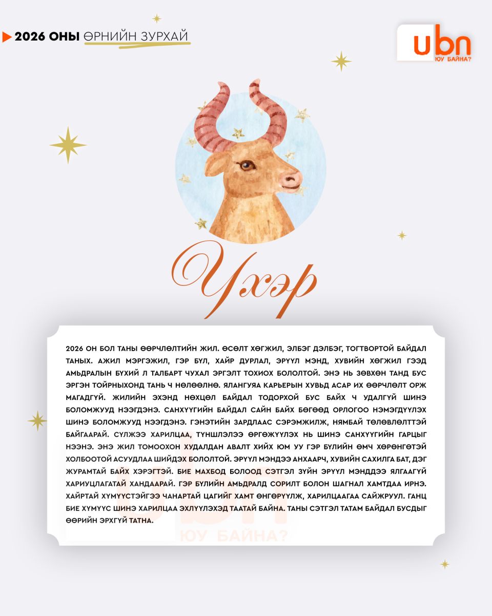 2026 он бол эерэг өөрчлөлтийн жил. Аливаа өөрчлөлт хэр хурдан гэдэгтээ биш хэр тогтвортой вэ гэдэгтээ чухал. Хийж байгаа алхам бүрийнхээ ач холбогдлыг ойлгож, мэдрэх хэрэгтэй. Таны карьер энэ жил зөв чиглэлд ахина. Шинэ боломжууд таны өмнө нээгдэх ч гэлээ үүний тулд багагүй хүчин чармайлт гаргах болно. Жилийн эхний хэдэн сарыг ирээдүйн бат бөх суурь тавих мөч гэж ойлгоорой. Заримдаа ажил хүнд санагдаж болох ч энэ нь ирээдүйд том шагнал авчрах алхам болно. Жилийн эхний хагаст санхүүгийн зарцуулалтдаа анхааралтай байх хэрэгтэй. Санхүүгийн шийдвэр гаргахдаа ухаалаг, стратегитэй хандаарай. Ухаалаг шийдвэр гаргах нь урт хугацааны тогтвортой баялгийг бий болгоно. Эрүүл мэндийн байдал сайн байна. Гэр бүлийн харилцаа жилийн эхэнд бага зэрэг хурцдаж, ойлгомжгүй байдал үүсч магадгүй. Таны тэвчээр эв нэгдлийг хадгалахад тусална. Гэр бүлтэйгээ чанартай, үр бүтээлтэй цагийг өнгөрүүлэх нь зөв. Ганц бие хүмүүс хайр дурлалаа олох магадлалтай. Итгэлцэл, үнэнч байдал таны харилцааны хамгийн хүчирхэг хэрэгсэл болно.