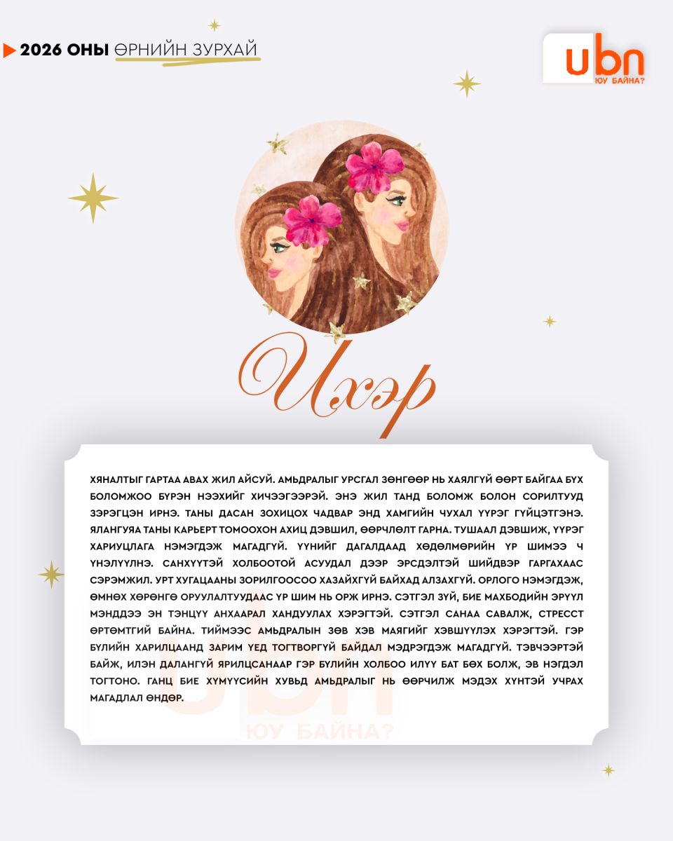 2026 он таны хувьд өсөлт, өөрчлөлтийн жил байх болно. Сэтгэл хөдөлгөм шинэ дүрээр та амьдрах бололтой. Таны өмнө тулгарсан сорилт, бэрхшээл бүрийг боломж, давуу тал болгон хувиргаарай. Мөрөөдлийн дүрдээ тоглохоор шалгуулах гэж байгаа жүжигчин мэт мэдрэмж танд төрнө. Сэтгэл түгшмээр боловч үнэ цэнтэй туршлага байх болно. Жилийн эхэнд бие, сэтгэлийн хувьд ядрах мэдрэмж авч магадгүй. Гэхдээ тууштай байдал таны эцэстээ шагнагдах болно. Санхүүгийн хувьд хэмнэлт шаардлагатай жил. Орчлон ертөнц таны санхүүгийн сахилга батыг шалгаад байгаа бололтой. Гэхдээ жилийн дунд үеэс орлого нэмэгдэж, жилийн сүүлээр улам тогтворжино. Энэ жил эрүүл мэнддээ онцгой анхаарах хэрэгтэй. Ядаргаа, стресс нь өөртөө анхаарал тавих хэрэгтэй гэсэн дохио юм. Гэр бүлийн харилцаа жилийн эхэнд жаахан хурцдаж магадгүй ч удаан үргэлжлэхгүй. Жил өнгөрөх тусам гэр бүлийн харилцаа амар тайван, эв нэгдэлтэй болно. Ганц бие хүмүүсийн хувьд энэ жил яг л олон ангит кино шиг байх бололтой.