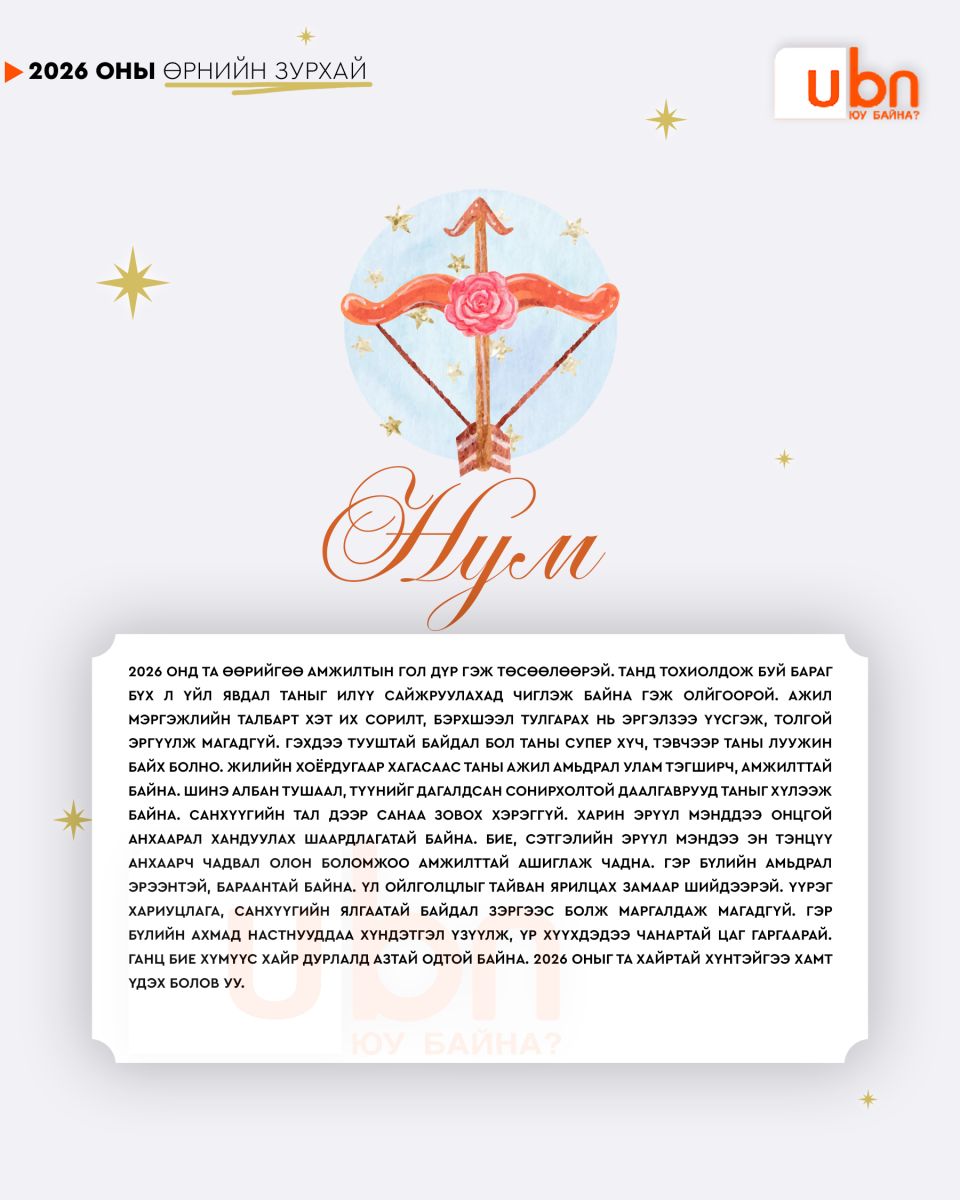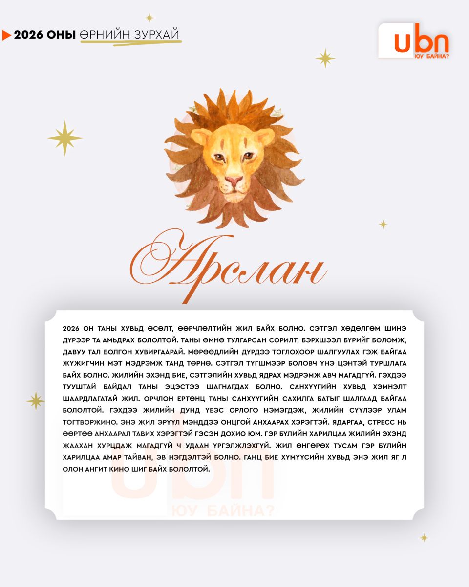 2026 он бол таны жил. Таны гаргасан шийдвэр бүр үнэнд ойрхон байж, зорилгодоо улам ойртоно. Тайзны ард хангалттай их байлаа, одоо гэрэлд гарч ирэх, тодрох цаг тань болжээ. Шинэ эхлэл, хязгааргүй боломж амлах 2026 он айсуй. Алхам бүр тань хожил авчрах шатрын нүүдэл л гэсэн үг. Ажил мэргэжлээ солих, эсвэл жинхэнэ хүсэл сонирхлоо таньж мэдэж магадгүй. Энэ бүх өөрчлөлт тийм амар хийгдэхгүй. Мэдээж томоохон сорилт болох тул танаас тэвчээр, ойлголцлыг шаардана. Дарамттай үед сэтгэл зүйгээ хянаж чадвал та улам хүчирхэгжинэ. Санхүүгийн хувьд бага зэрэг савлагаатай жил болно. Орлого харьцангуй тогтвортой байх ч гэлээ гэнэтийн зарлага их байна. Иймээс мөнгөө нарийн стратегитэй удирдаарай. Энэ жил эрүүл мэнддээ онцгой анхаарах хэрэгтэй. Бясалгал, йог, төвлөрөл зэрэг бол зүгээр нэг моод биш. Харин тэнцвэрийг хадгалах нууц зэвсэг гэдгийг санаарай. Эрүүл мэнддээ хийсэн хөрөнгө оруулалт бүхэн эргээд ач тусаа өгнө. Гэр бүлийн амьдралд бага зэрэг үл ойлголцол, хурцадмал байдал үүсч магадгүй. Тэвчээр таны хамгийн том давуу тал гэдгийг санаарай. Ганц бие хүмүүсийн хувьд энэ жил хайр дурлалын бурхны хараанд ахиухан өртөх бололтой. Нээлттэй, үнэнч байдал харилцааг улам бэхжүүлнэ. Ярилцахаас бүү зайлсхий.