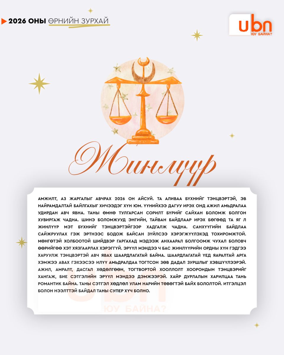Амжилт, аз жаргалыг авчрах 2026 он айсуй. Та аливаа бүхнийг тэнцвэртэй, эв найрамдалтай байлгахыг хичээдэг хүн юм. Үүнийхээ дагуу ирэх онд ажил амьдралаа удирдан авч явна. Таны өмнө тулгарсан сорилт бүрийг сайхан боломж болгон хувиргаж чадна. Шинэ боломжууд энгийн, тайван байдлаар ирэх бөгөөд та яг л жинлүүр мэт бүхнийг тэнцвэртэйгээр хадгалж чадна. Санхүүгийн байдлаа сайжруулах гэж эртнээс бодож байсан зүйлсээ хэрэгжүүлэхэд тохиромжтой. Мөнгөтэй холбоотой шийдвэр гаргахад мэдээж анхаарал болгоомж чухал боловч өөрийгөө хэт хязгаарлах хэрэггүй. Эрүүл мэндээ ч бас жинлүүрийн ордны хүн гэдгээ харуулж тэнцвэртэй авч явах шаардлагатай байна. Шаардлагатай үед яаралтай арга хэмжээ авах гэхээсээ илүү амьдралдаа тогтсон зөв дадал зуршлыг хэвшүүлээрэй. Ажил, амралт, дасгал хөдөлгөөн, тогтвортой хооллолт хоорондын тэнцвэрийг хангаж, бие сэтгэлийн эрүүл мэндээ дэмжээрэй. Хайр дурлалын харилцаа тань романтик байна. Таны сэтгэл хөдлөл улам нарийн төвөгтэй байх бололтой. Итгэлцэл болон нээлттэй байдал таны супер хүч болно.