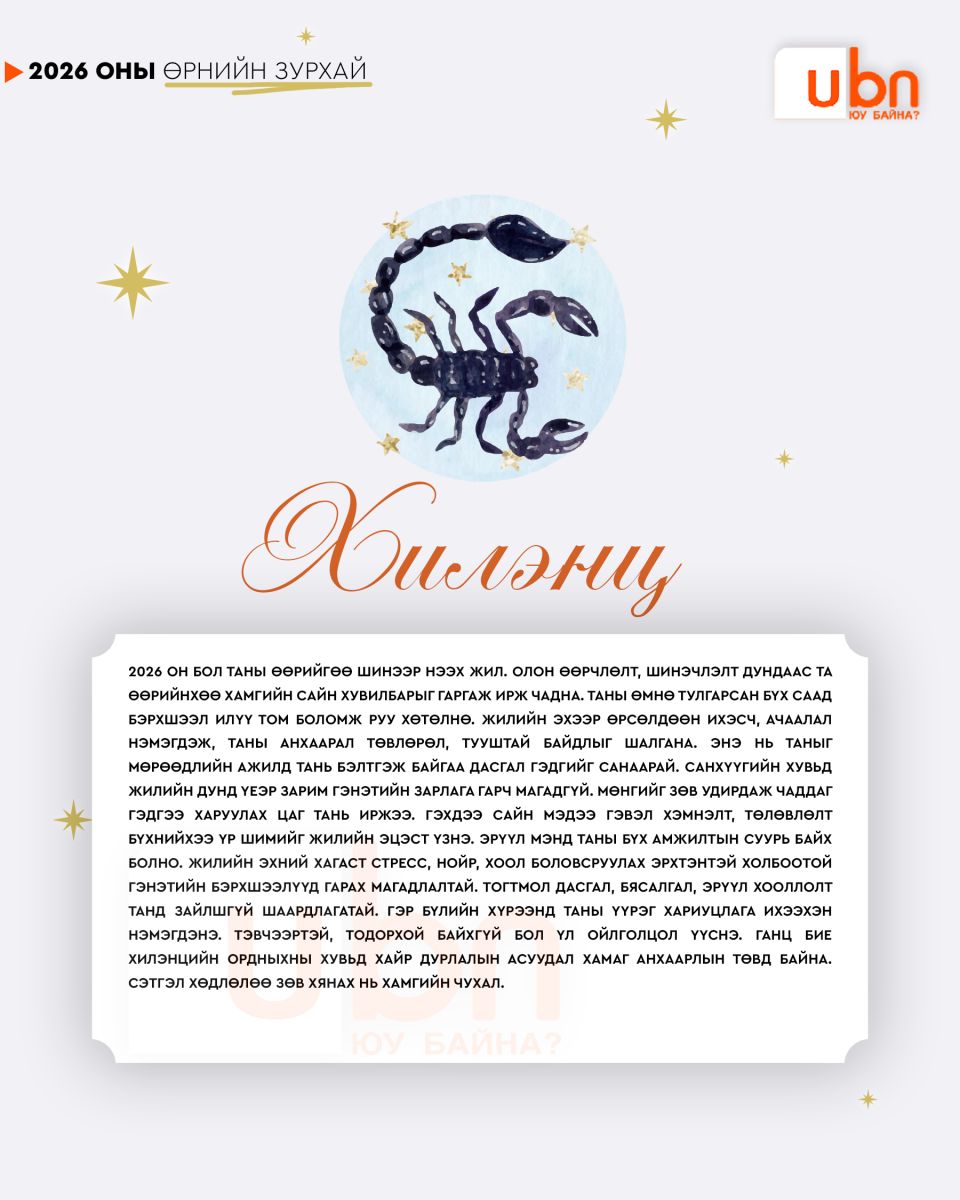 2026 он бол таны өөрийгөө шинээр нээх жил. Олон өөрчлөлт, шинэчлэлт дундаас та өөрийнхөө хамгийн сайн хувилбарыг гаргаж ирж чадна. Таны өмнө тулгарсан бүх саад бэрхшээл илүү том боломж руу хөтөлнө. Жилийн эхээр өрсөлдөөн ихэсч, ачаалал нэмэгдэж, таны анхаарал төвлөрөл, тууштай байдлыг шалгана. Энэ нь таныг мөрөөдлийн ажилд тань бэлтгэж байгаа дасгал гэдгийг санаарай. Санхүүгийн хувьд жилийн дунд үеэр зарим гэнэтийн зарлага гарч магадгүй. Мөнгийг зөв удирдаж чаддаг гэдгээ харуулах цаг тань иржээ. Гэхдээ сайн мэдээ гэвэл хэмнэлт, төлөвлөлт бүхнийхээ үр шимийг жилийн эцэст үзнэ. Эрүүл мэнд таны бүх амжилтын суурь байх болно. Жилийн эхний хагаст стресс, нойр, хоол боловсруулах эрхтэнтэй холбоотой гэнэтийн бэрхшээлүүд гарах магадлалтай. Тогтмол дасгал, бясалгал, эрүүл хооллолт танд зайлшгүй шаардлагатай. Гэр бүлийн хүрээнд таны үүрэг хариуцлага ихээхэн нэмэгдэнэ. Тэвчээртэй, тодорхой байхгүй бол үл ойлголцол үүснэ. Ганц бие хилэнцийн ордныхны хувьд хайр дурлалын асуудал хамаг анхаарлын төвд байна. Сэтгэл хөдлөлөө зөв хянах нь хамгийн чухал.