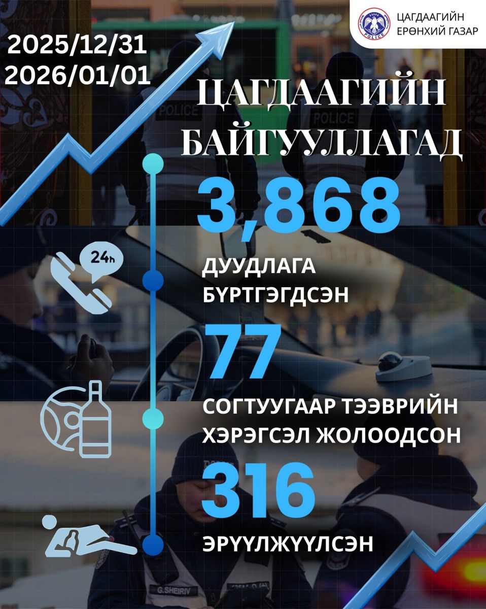 Цагдаагийн байгууллагын 102 тусгай дугаарын утсанд баяр, амралтын өдрүүдэд /2025.12.31-2026.01.01/ нийт 3868 дуудлага, мэдээлэл бүртгэгджээ. Үүнээс зөрчлийн шинжтэй 1302, гэмт хэргийн шинжтэй 174 дуудлага, мэдээлэл байна.