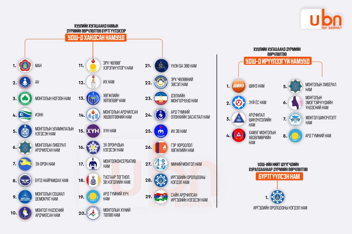 Хуулийн хугацаа буюу 2025 оны 12 дугаар сарын 31-ний дотор дараах 29 улс төрийн нам үндсэн дүрэм, хөтөлбөрийн өөрчлөлтөө бүртгүүлэхээр нийт 58 удаа ханджээ. Эргэн сануулахад, өнгөрөгч оны 11 дүгээр сард буюу нэг сарын л хугацаа үлдээд байхад парламентад суудалтай намуудаас ердөө хоёр нь буюу Ардчилсан нам, ИЗНН л УДШ-д хандаад байв.