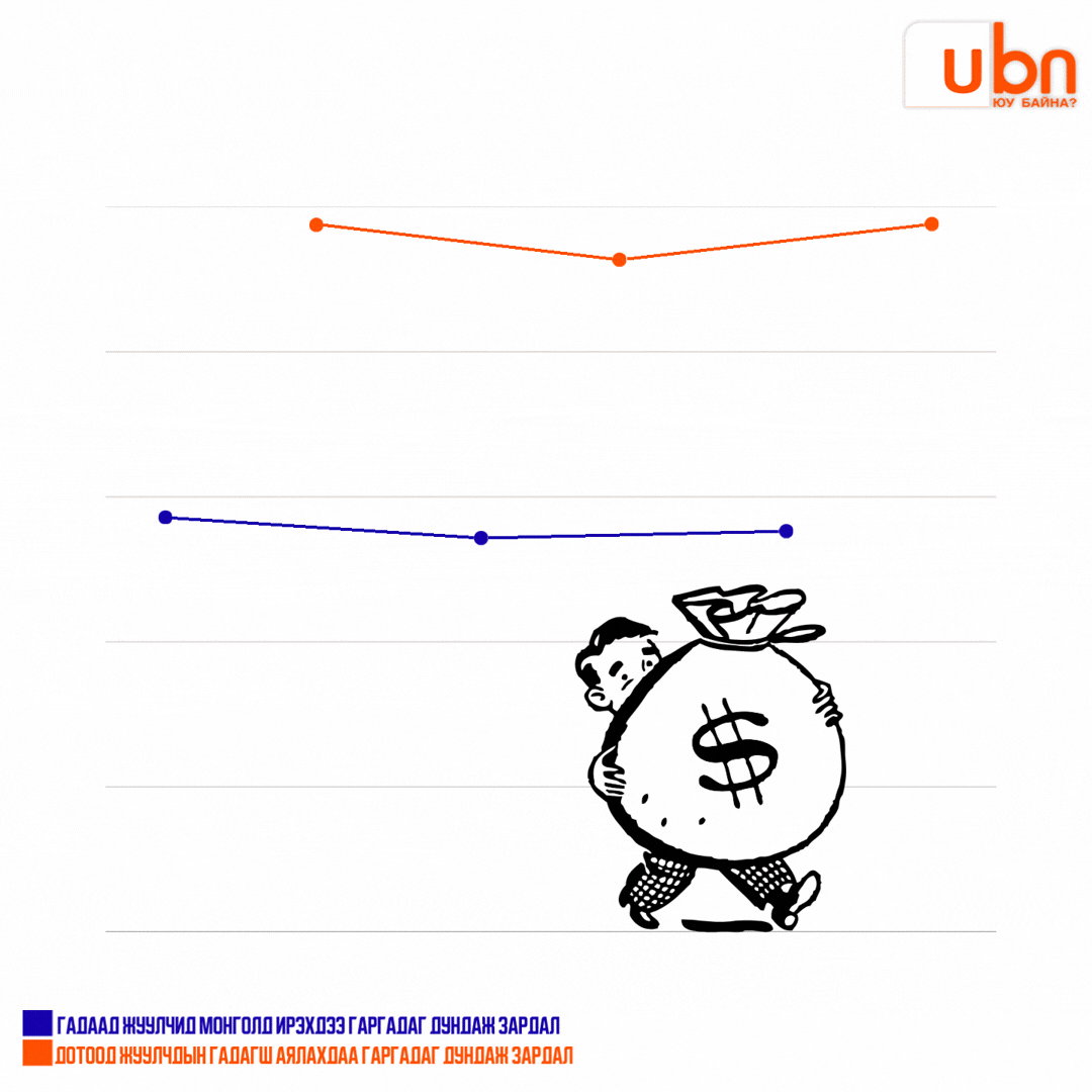 Бид гадаад болон дотоодын жуулчдаас олсон орлого, зарлагын дүнг мэдэж авлаа. Тэгвэл аяллын дундаж өртөг хэр байгааг бид сонирхлоо. Тодруулбал, ханшны зөрүү болон бусад хүчин зүйлээс шалтгаалан манай улсын иргэдийн гадаадад аялахдаа зарцуулж буй дундаж зардал бусад улсын иргэдийн монголд ирэхдээ гаргаж буй зардлаас өндөр байгаа нь дараах графикаас харагдана.