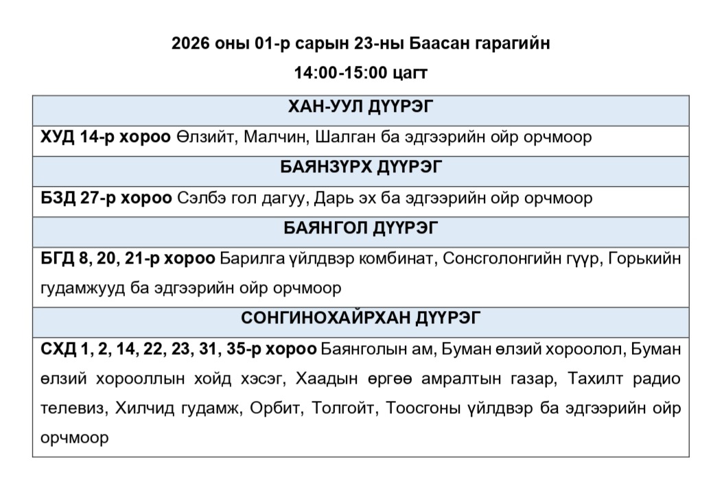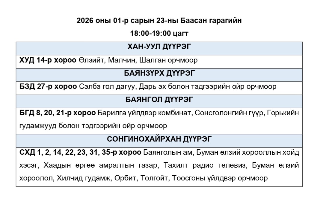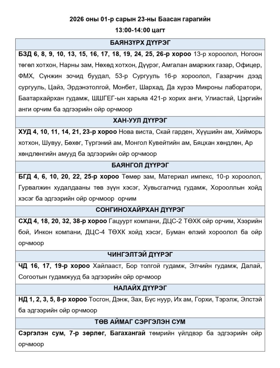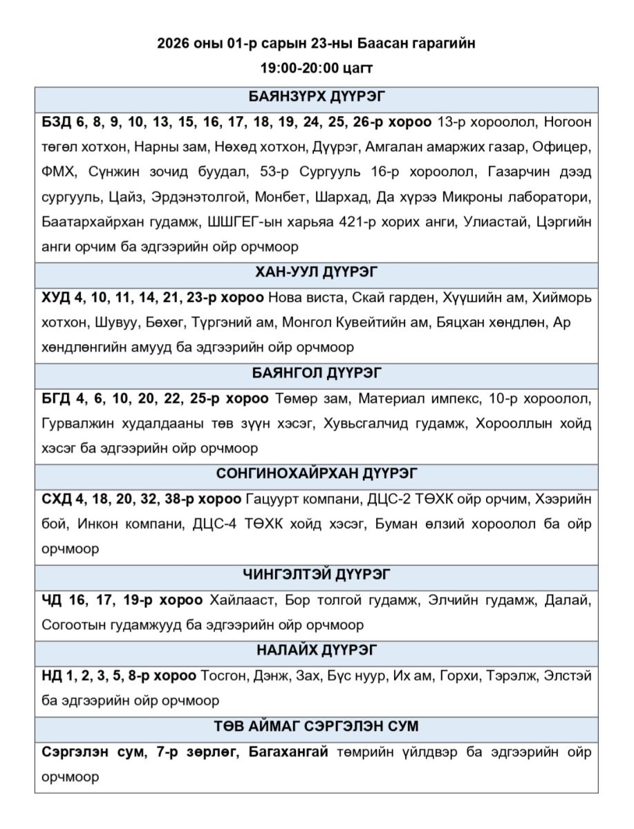 Эрчим хүчний чадлын дутагдлаас шалтгаалан 2026 оны 01-р сарын 23-ны Баасан гарагт цахилгаан эрчим хүчний “ХЯЗГААРЛАЛТ ХИЙЖ БОЛЗОШГҮЙ” байршлуудын хуваарийг хүргэж байна.