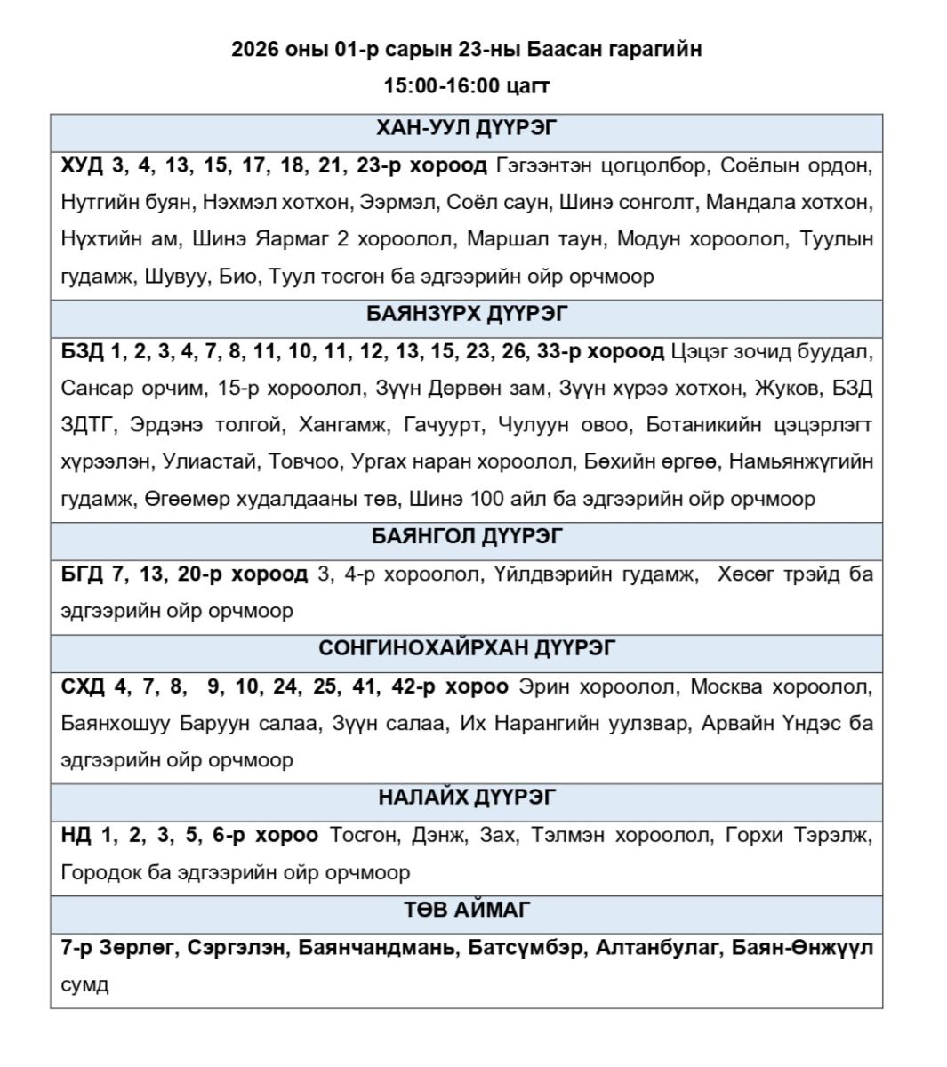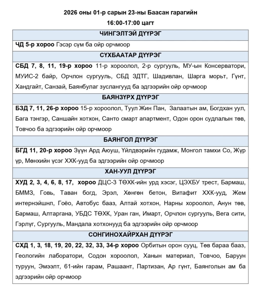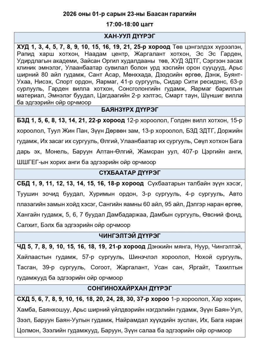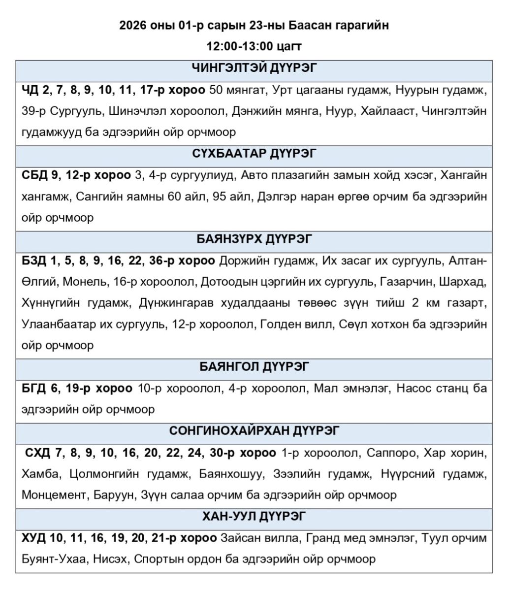 Эрчим хүчний чадлын дутагдлаас шалтгаалан 2026 оны 01-р сарын 23-ны Баасан гарагт цахилгаан эрчим хүчний “ХЯЗГААРЛАЛТ ХИЙЖ БОЛЗОШГҮЙ” байршлуудын хуваарийг хүргэж байна.