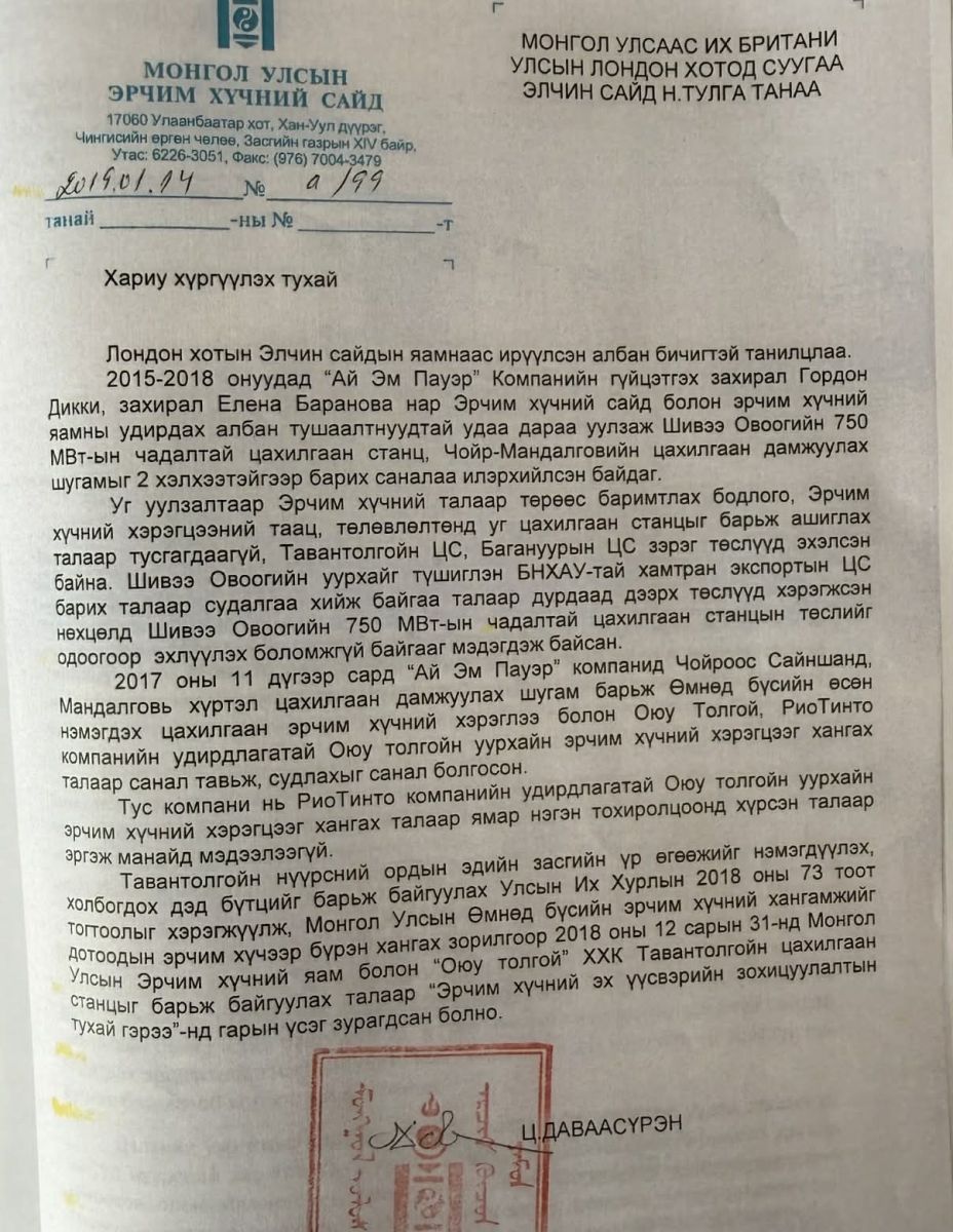 Хариуд нь Ерөнхий сайд асан С.Баяр Шивээ-Овоогийн цахилгаан станцыг зогсоосон тухай Ц.Даваасүрэн сайдын гарын үсэгтэй баримтыг твиттер хуудаснаа жиргэлээ.