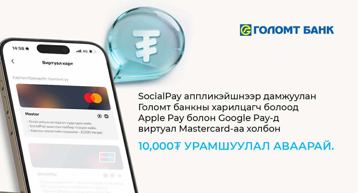 Урамшууллын хүрээнд дээрх төлбөрийн хэрэгслүүдэд Голомт банкны Mastercard брэндийн виртуал картаа шинээр холбосон харилцагчдад 10,000₮-ийн мөнгөн урамшуулал олгох юм. Хараахан Mastercard виртуал карт захиалж амжаагүй хүмүүс SocialPay аппликэйшний “Хэтэвч” цэсээр дамжуулан виртуал картаа идэвхжүүлэх боломжтой.