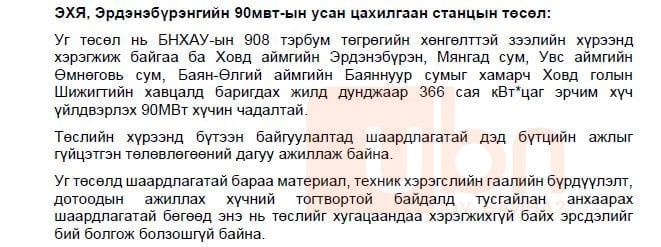 Тэгвэл ажил нь удааширсан эсвэл гацсан эрчим хүчний зарим төслийг аудитын байгууллагаас дараах байдлаар дүгнэсэн байна. Тухайлбал, Эрдэнэбүрэнгийн УЦС-ын төсөлд шаардлагатай бараа материал, техник хэрэгслийн гаалийн бүрдүүлэлт, дотоодын ажиллах хүчний тогтвортой байдалд тусгайлан анхаарах шаардлагатай бөгөөд энэ нь төслийг хугацаандаа хэрэгжихгүй байх эрсдэлийг бий болгож болзошгүй байна гэжээ.
