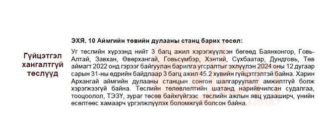 Тэгвэл хамгийн ихээр хэл ам дагуулж, төсөл хэрэгжүүлэгч БНСУ-ын "Бюксан инженеринг" компани нь "дампуурсан" 10 аймгийг эрчим хүчээр хангах цахилгаан станцын ажил гацсан байдлыг ингэж дүгнэжээ. Төслийн хүрээнд нийт 3 багц ажил хэрэгжүүлсэн гэх бөгөөд Баянхонгор, Говь-Алтай, Завхан, Өвөрхангай, Говьсүмбэр, Хэнтий, Сүхбаатар, Дундговь, Төв аймагт 2022 онд гэрээ байгуулан барилга угсралтыг эхлүүлэн 2024 оны 12 дугаар сарын 31-ний байдлаар 3 багц ажил 45.2 хувийн гүйцэтгэлтэй гэж дүгнэгдсэн байна.