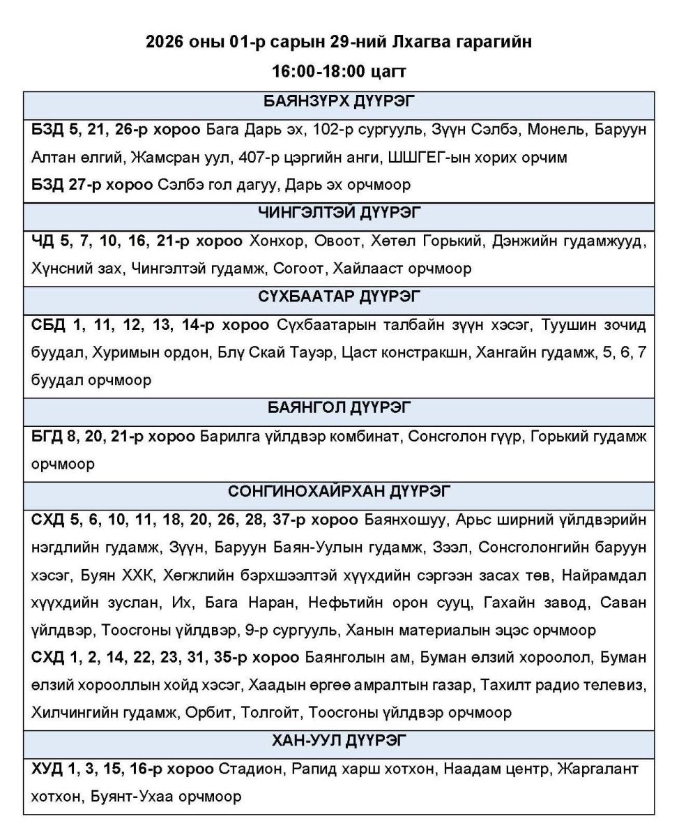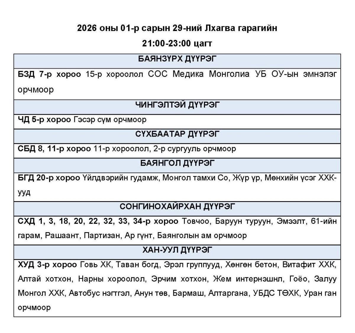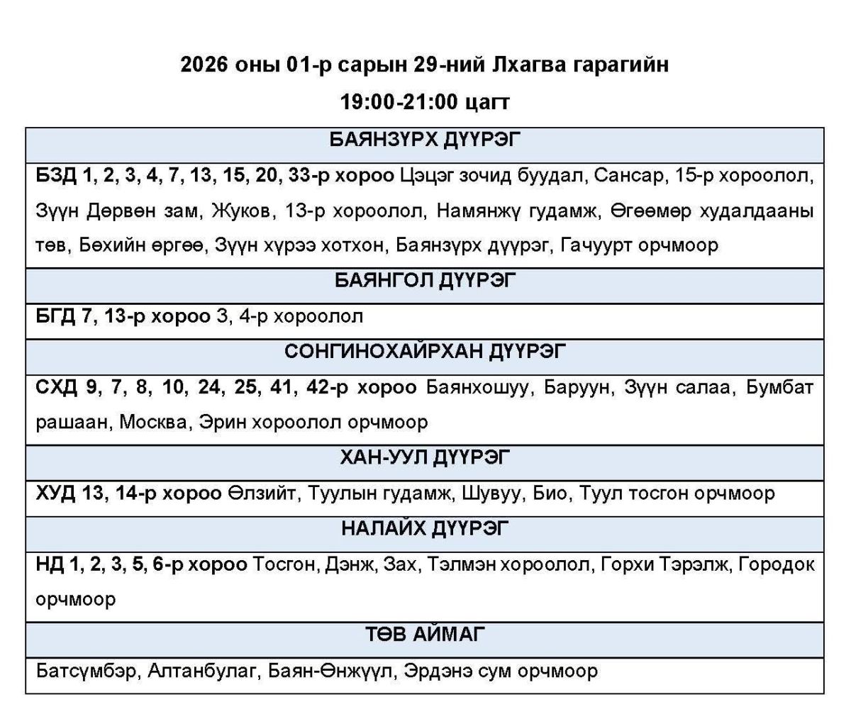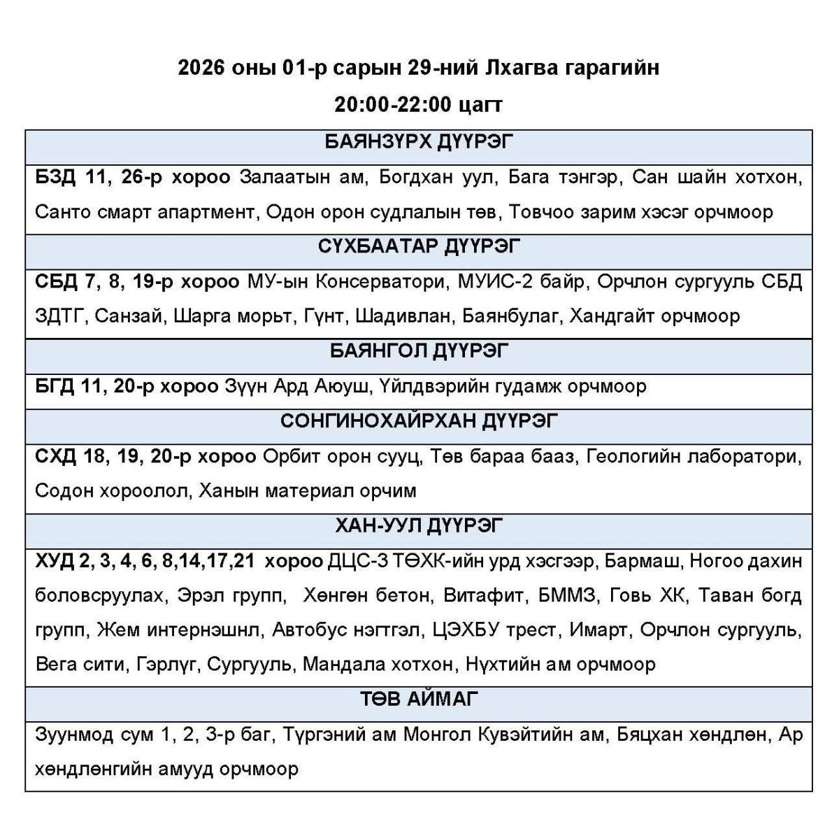 Эрчим хүчний системд аваарын горим үүсэхээс сэргийлэн нэгдсэн сүлжээнд холбогддог тодорхой байршлуудад цахилгаан эрчим хүчний төлөвлөсөн хэрэглээг “Диспетчерийн үндэсний төв” ТӨХХК-ийн шийдвэрээр хуваарийн дагуу 2 цагийн хугацаатай хязгаарлах арга хэмжээ авч байна.