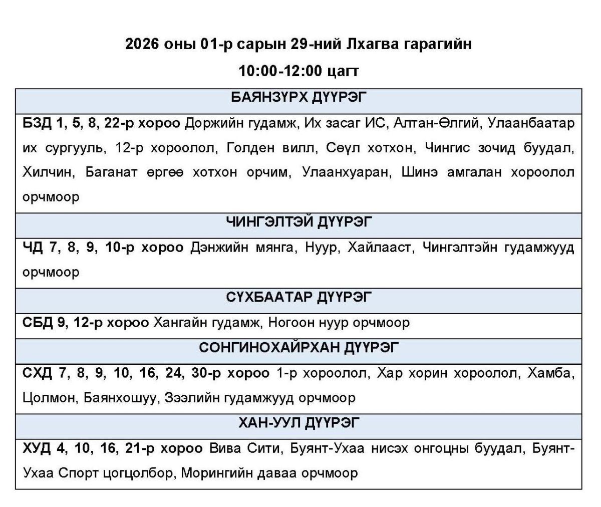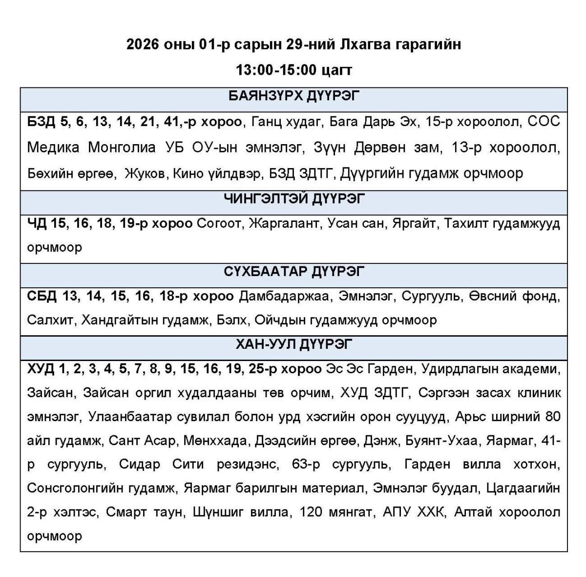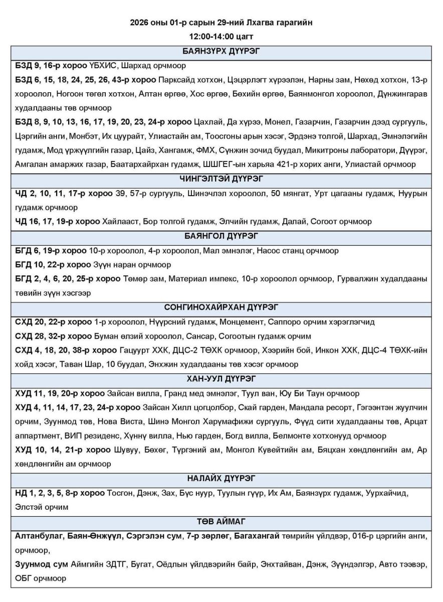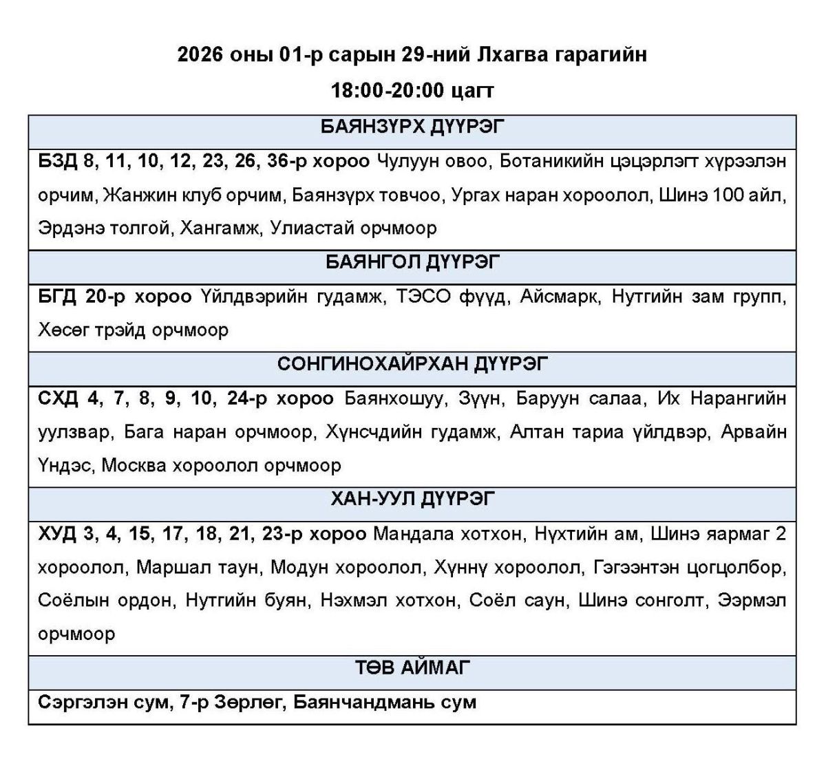Эрчим хүчний системд аваарын горим үүсэхээс сэргийлэн нэгдсэн сүлжээнд холбогддог тодорхой байршлуудад цахилгаан эрчим хүчний төлөвлөсөн хэрэглээг “Диспетчерийн үндэсний төв” ТӨХХК-ийн шийдвэрээр хуваарийн дагуу 2 цагийн хугацаатай хязгаарлах арга хэмжээ авч байна.