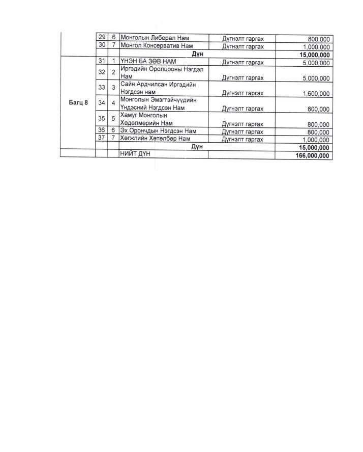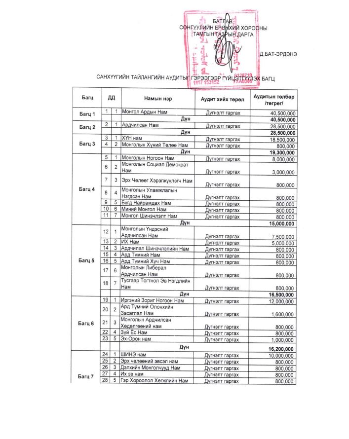 Тус ажлыг найман багц хэсэг болгон хувааж гүйцэтгүүлэх бөгөөд түүнд 38 намын аудит багтаж байна. Багц тус бүрд багтаж буй нам нэг бүрийн аудитыг 800 мянгаас 40 сая төгрөг хүртэлх дүнгээр үнэлж байна. Тухайлбал, Монгол Ардын намын тайланд 40.5 сая, Ардчилсан намын тайланд 28 сая, ХҮН намын тайланд 18.5 сая төгрөгөөр аудит хийлгэхээр тусгажээ. Эл мэдээллийн дэлгэрэнгүйг хүргэвэл: