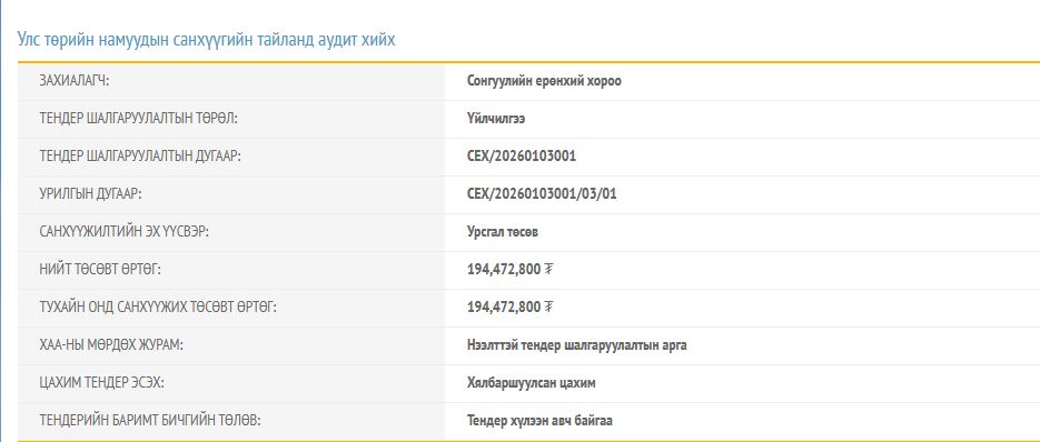 Сонгуулийн Ерөнхий хорооноос "Улс төрийн намуудын санхүүгийн тайланд аудит хийх" тендерийг зарлажээ. Тус тендерийн нийт төсөвт өртөг нь 194 сая 472 мянган төгрөг байхаар тусгасан байна. Харин төсөвт өртгийн эх үүсвэрийг тус газрын урсгал зардлын төсвөөс гаргахаар төлөвлөсөн байх аж.