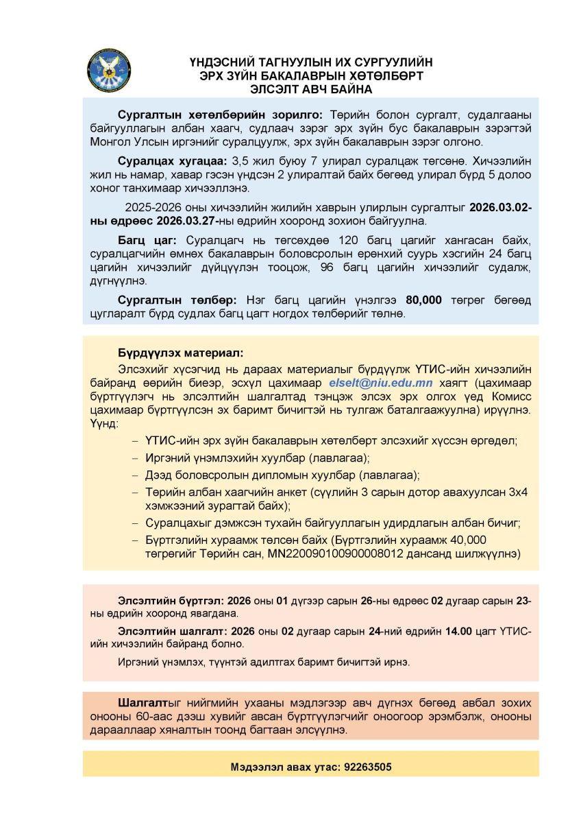 Элсэлтийн шалгалт: 2026 оны 02 дугаар сарын 24-ний өдрийн 14.00 цагт ҮТИСийн хичээлийн байранд болно.