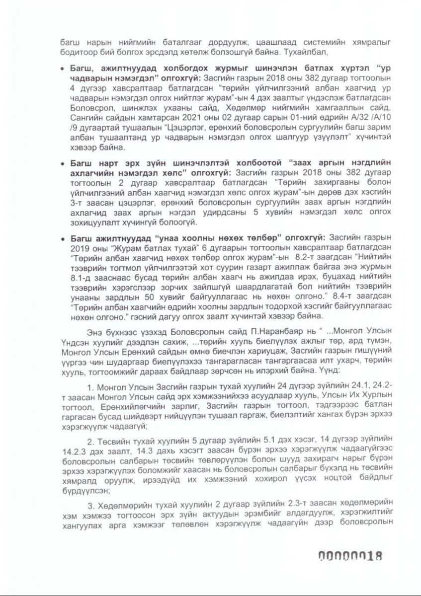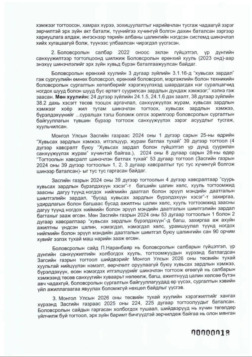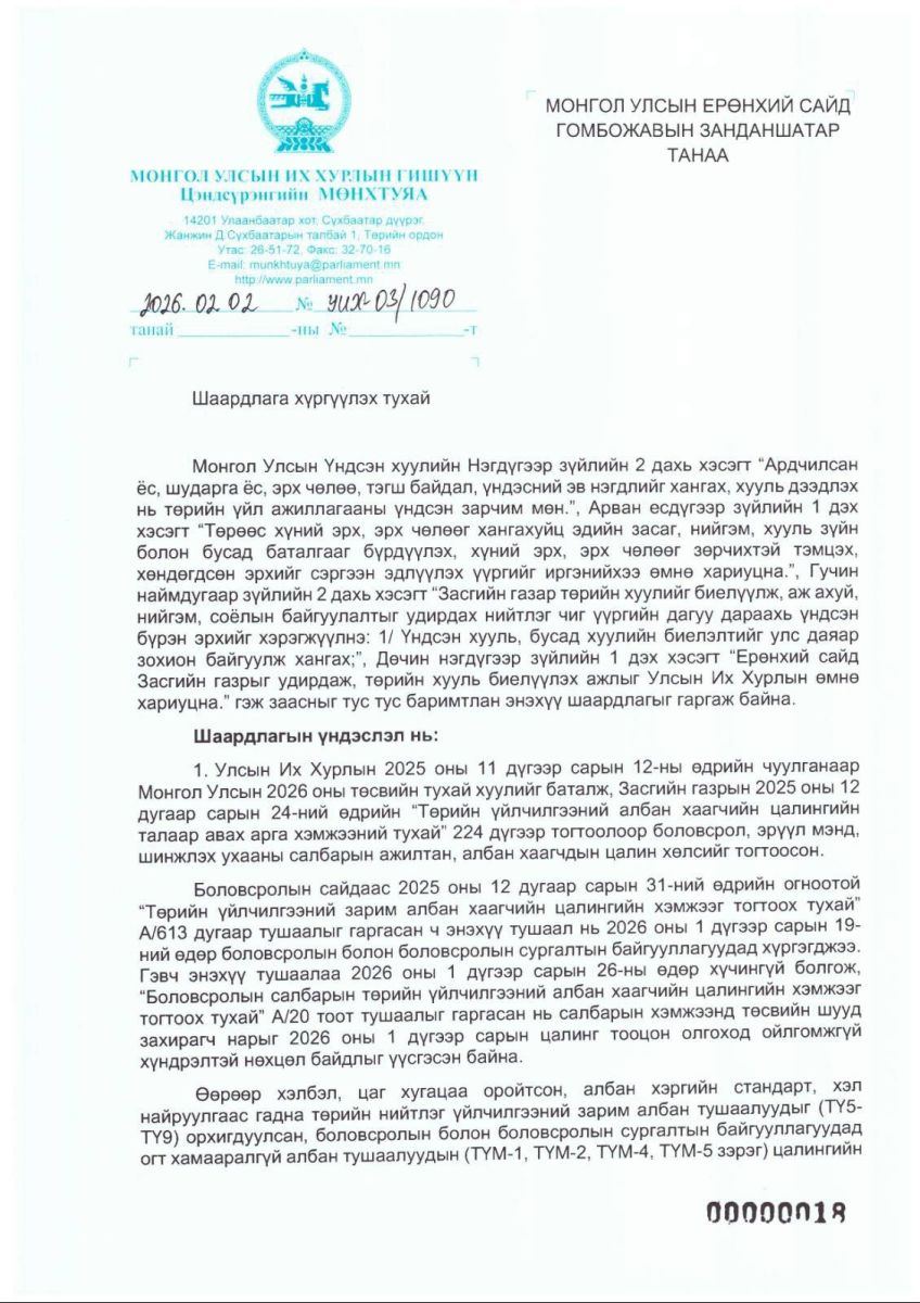УИХ-ын гишүүн Ц.Мөнхтуяа Боловсролын сайд П.Наранбаярыг огцруулах бичгийг хүргүүлжээ. Тодруулбал, тэрбээр Монгол Улсын Үндсэн хууль, Монгол Улсын Засгийн газрын тухай хууль, Төсвийн тухай хууль, Хөдөлмөрийн тухай хууль, Боловсролын ерөнхий хууль, Улсын Их Хурлын баталсан төсвийн бодлогыг илт зөрчиж, 2026 оны төсвийн хэрэгжилтийг санаатайгаар доголдуулж, олон мянган багш, ажилтны цалин хөлс, нийгмийн баталгааг дордуулсан гэж үзэж буй аж. Иймд багш, ажилтнуудын эрх ашгийг зөрчсөн гэдэг үндэслэлээр түүнийг огцрох ёстой гэж дурджээ.