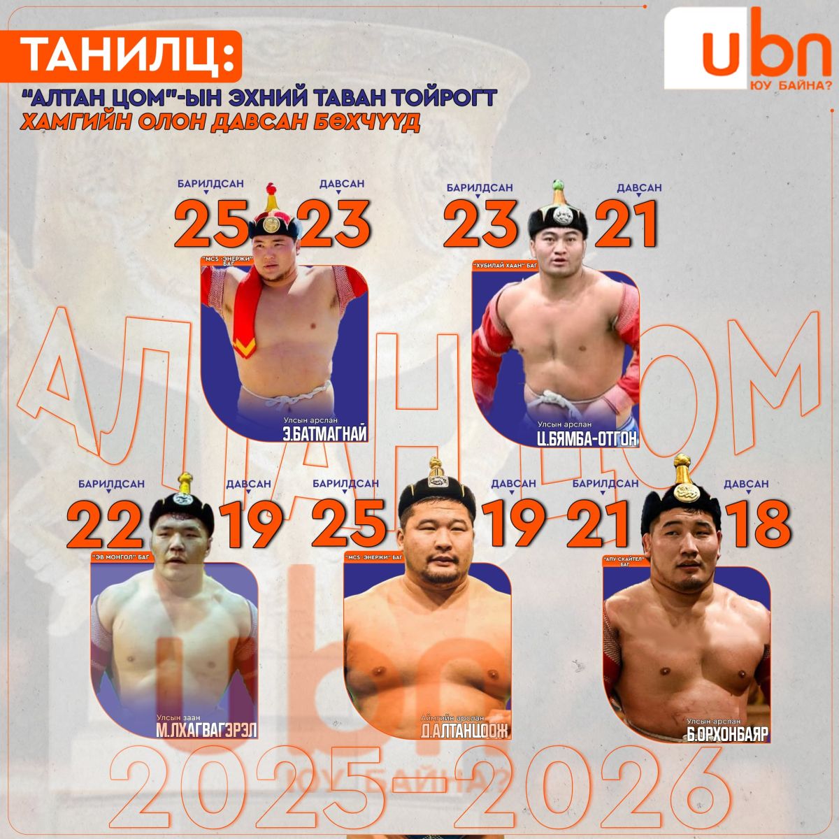 - “М-Си-Эс Энержи” баг Аймгийн арслан Д.Алтанцоож 25 барилдснаас 19 давж, 6 унасан