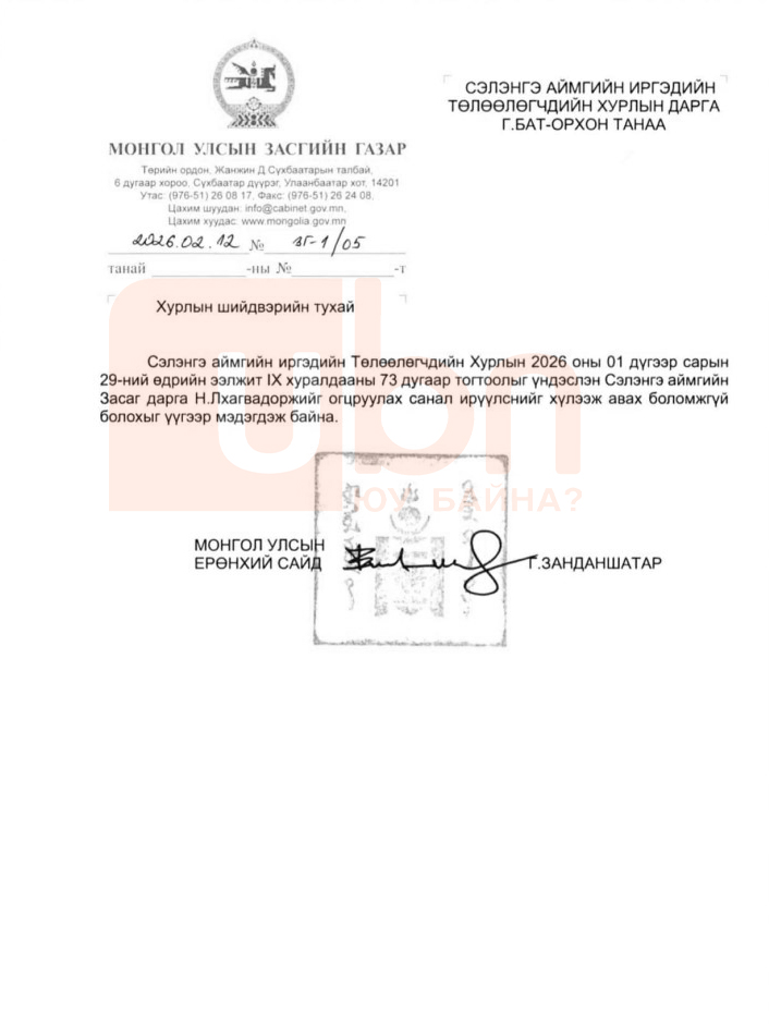 Тэгвэл Ерөнхий сайд Г.Занданшатар бүрэн эрхийнхээ хүрээнд дээрх саналыг хүлээн авах боломжгүй гэдгээ өчигдөр /02.12/ Сэлэнгэ аймгийн ИТХ-ын дарга Г.Бат-Орхонд албан бичгээр мэдэгдсэн байна.