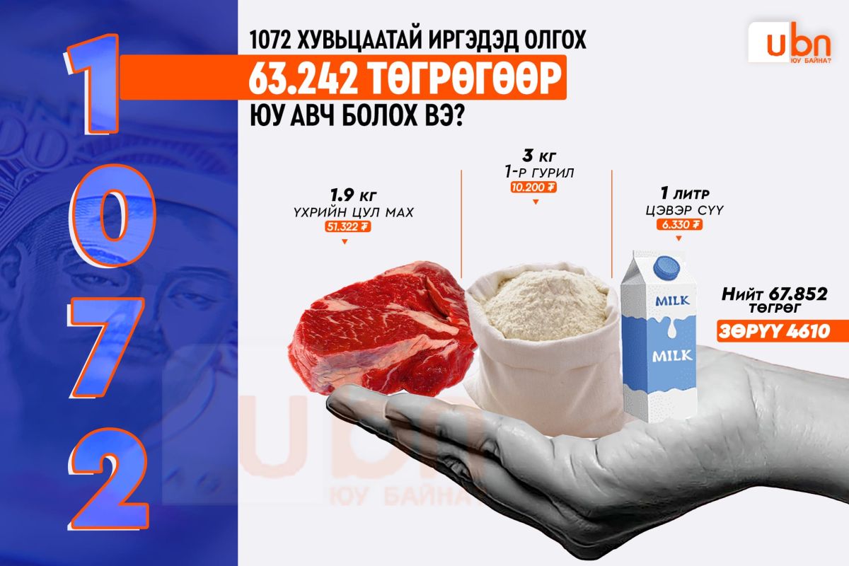 Ингэхэд 1.9 кг үхрийн цул мах, 3 кг нэгдүгээр гурил болон 1 литрийн савлагаатай цэвэр сүү авч, кассын ажилтанд бичүүлэв. Гэтэл бидэнд байсан 63.240 төгрөгийг даван 67.852 төгрөг болж, 4610 төгрөг дутаж байлаа.