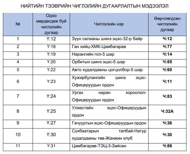 Нэршилд өөрчлөлт орсон автобусны чиглэлүүдийн маршрут, цагийн хуваарь, тээврийн хэрэгслийн тоонд өөрчлөлт орохгүй, зөвхөн чиглэлийн өмнөх үсэг өөрчлөгдөж байгааг анхаарна уу. Жишээ нь: Ү:20 байсан бол Ч:20 болж өөрчлөгдөж байгаа гэсэн үг.
