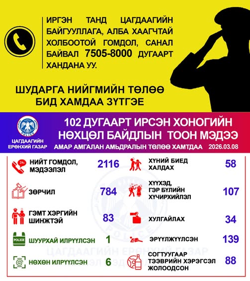Цагдаагийн байгууллагад Олон улсын эмэгтэйчүүдийн эрхийг хамгаалах өдөр буюу Март-8-нд 2116 дуудлага мэдээлэл бүртгэгджээ. Үүнээс гэр бүлийн хүчирхийлэл-107, согтуугаар тээврийн хэрэгсэл жолоодсон-88, эрүүлжүүлэгдсэн хүн-139 /эрэгтэй-119, эмэгтэй-20/ тус тус бүртгэгдсэн байна.